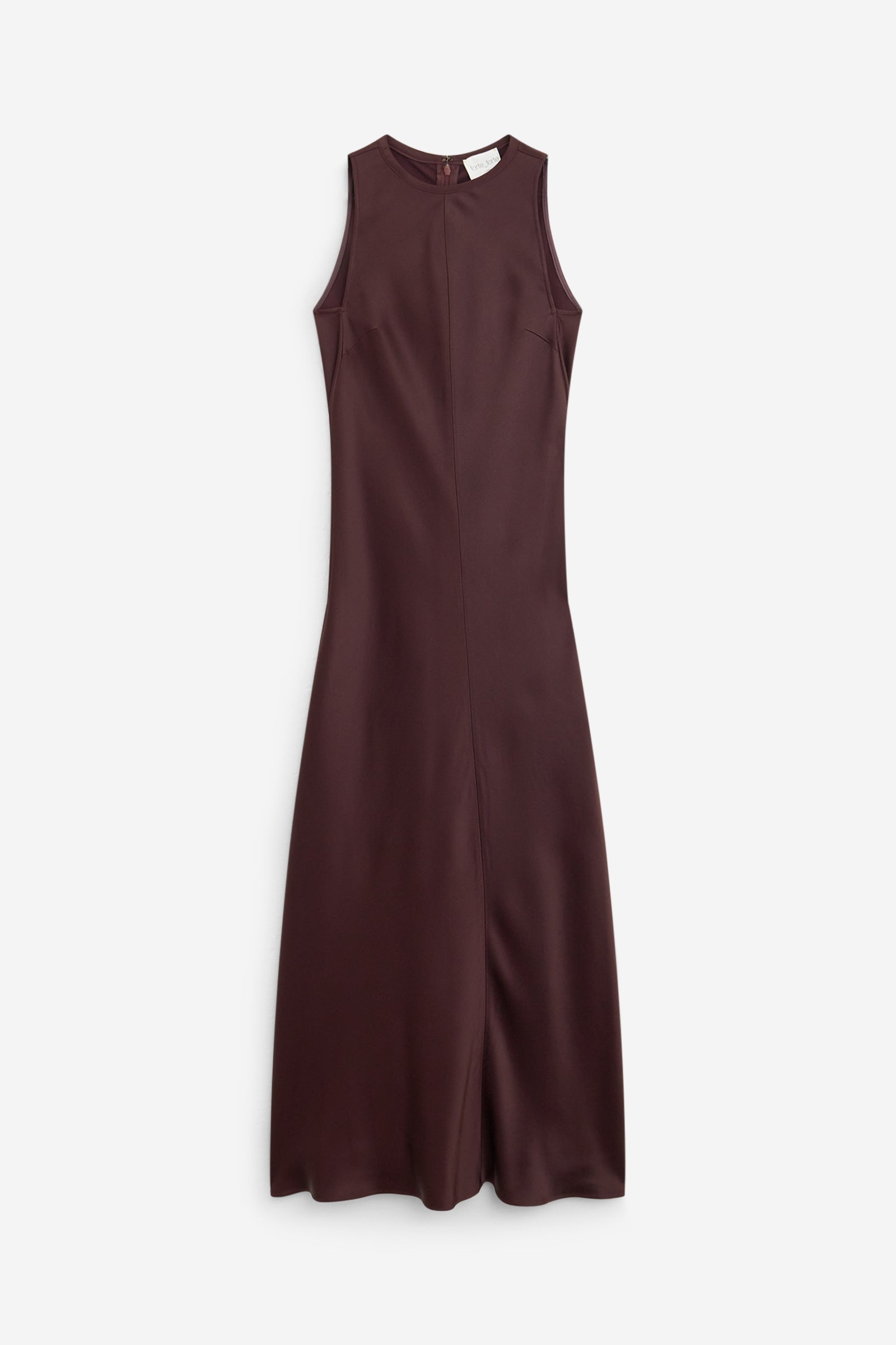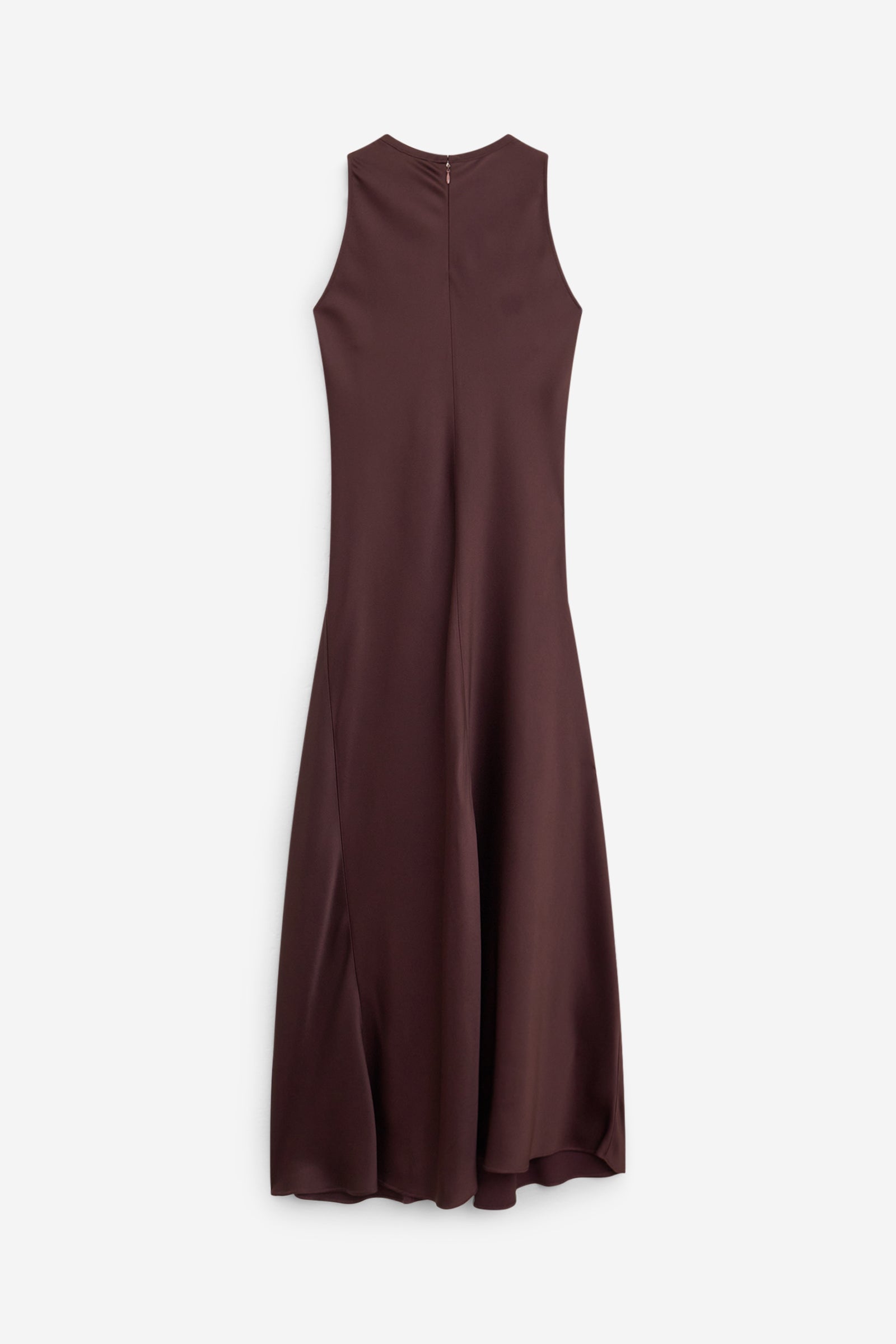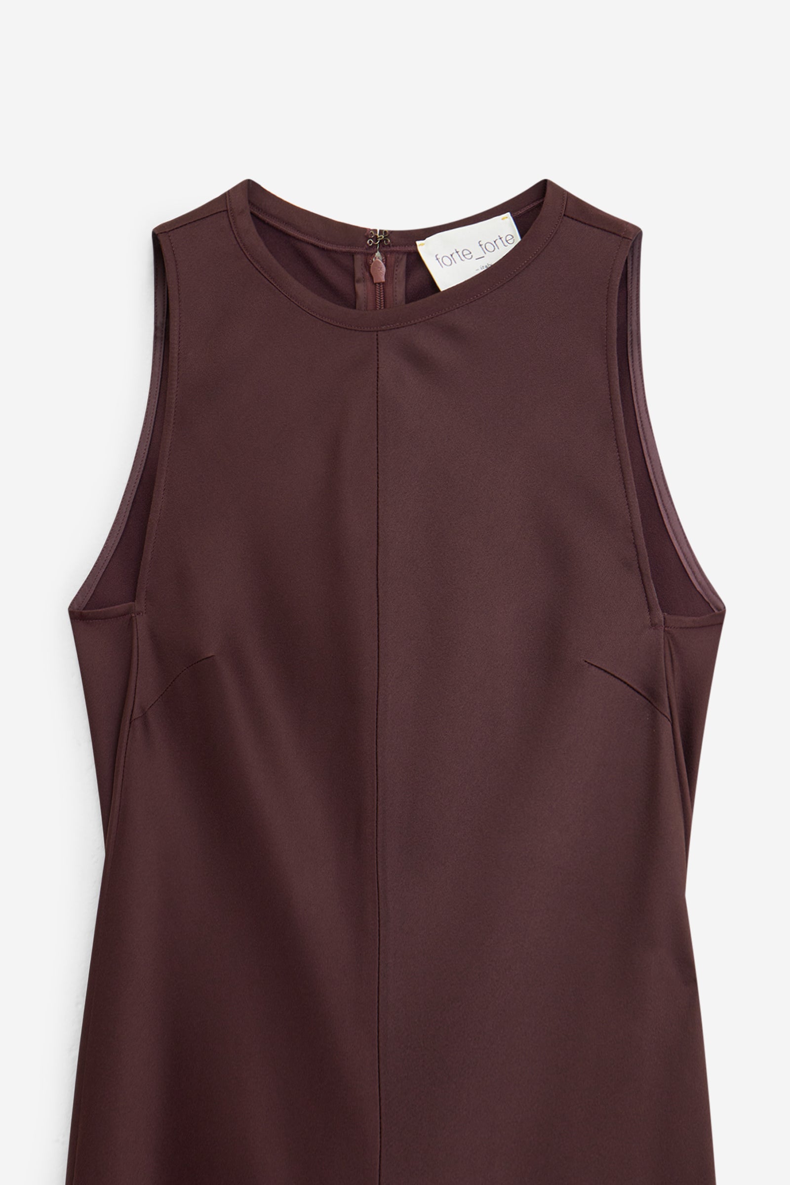 Abito in Acetato Marrone, smanicato, lunghezza alla caviglia, girocollo, cerniera posteriore