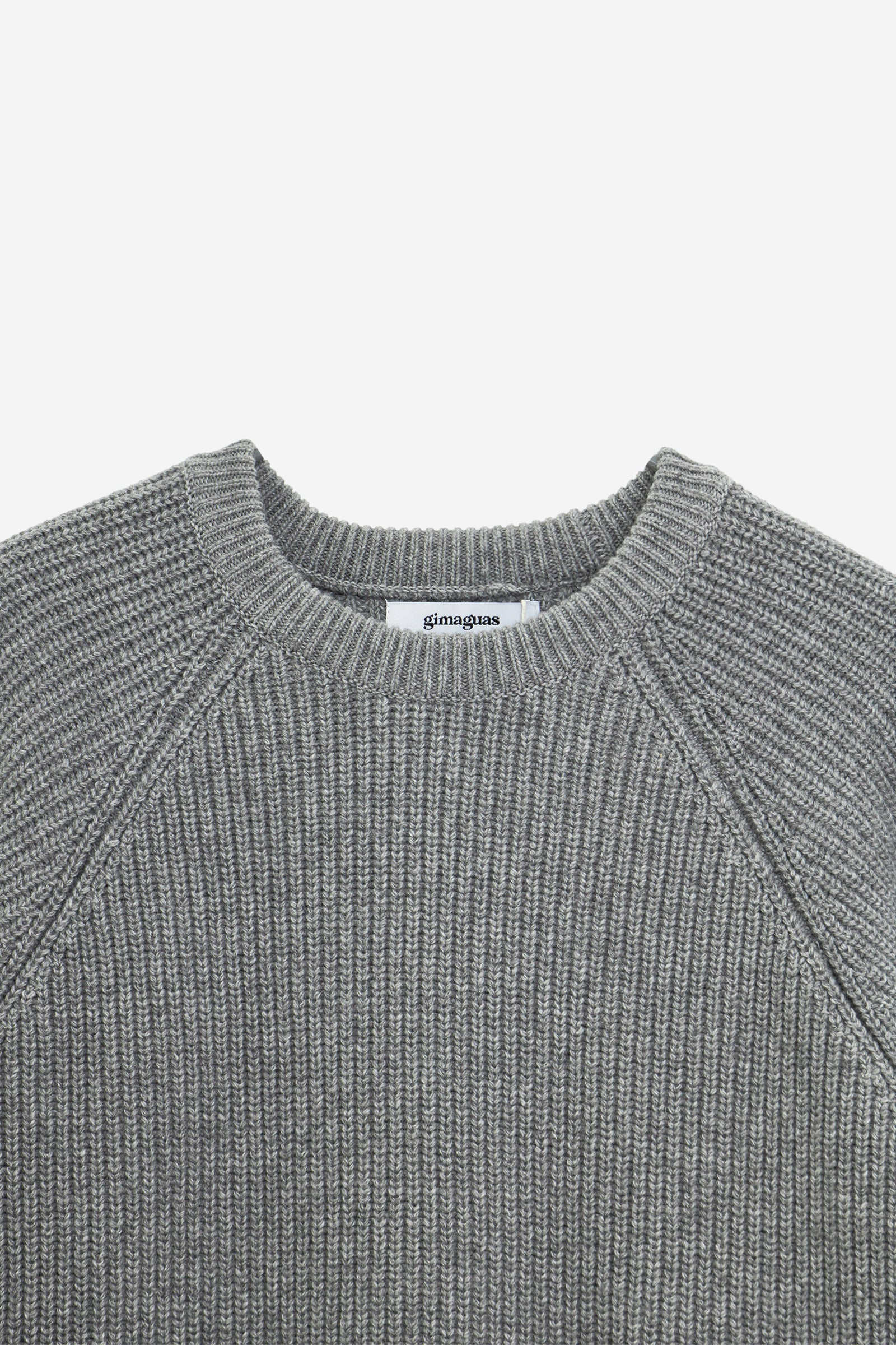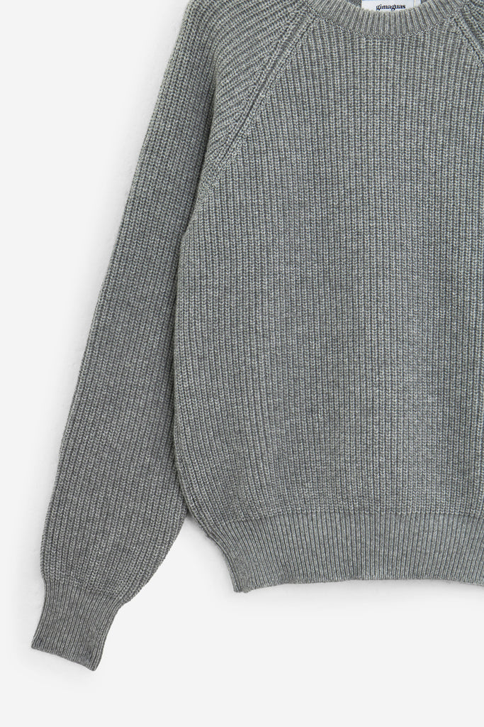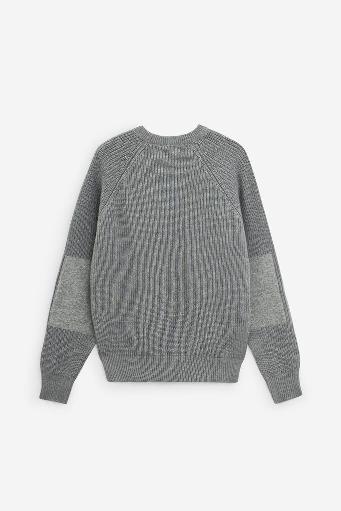 Maglione grigio a coste inglesi con maniche raglan. Le maniche sono lunghe e presentano un dettaglio patchwork sul gomito. La vestibilità è regolare con orlo e polsini a coste. Lo scollo è rotondo
