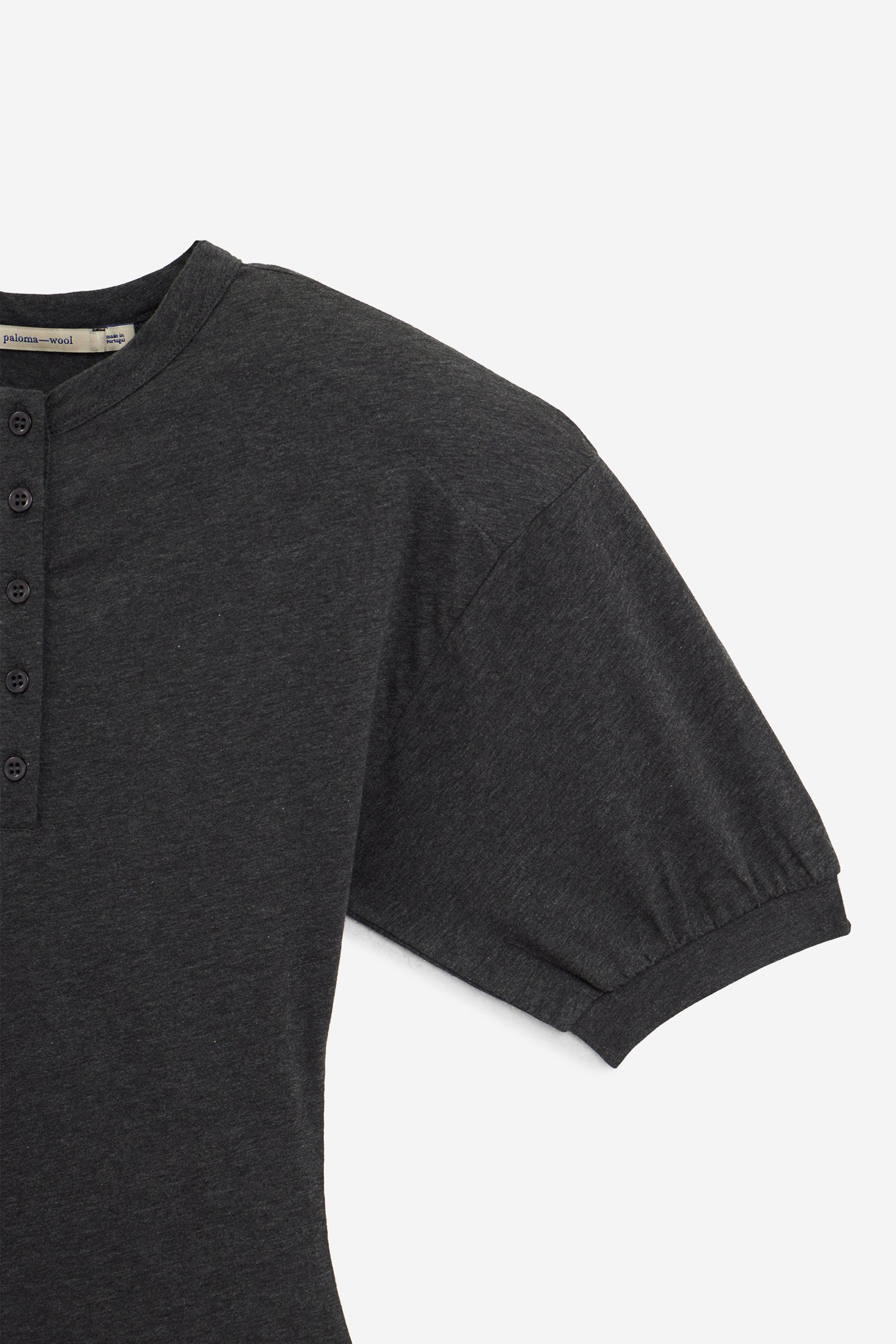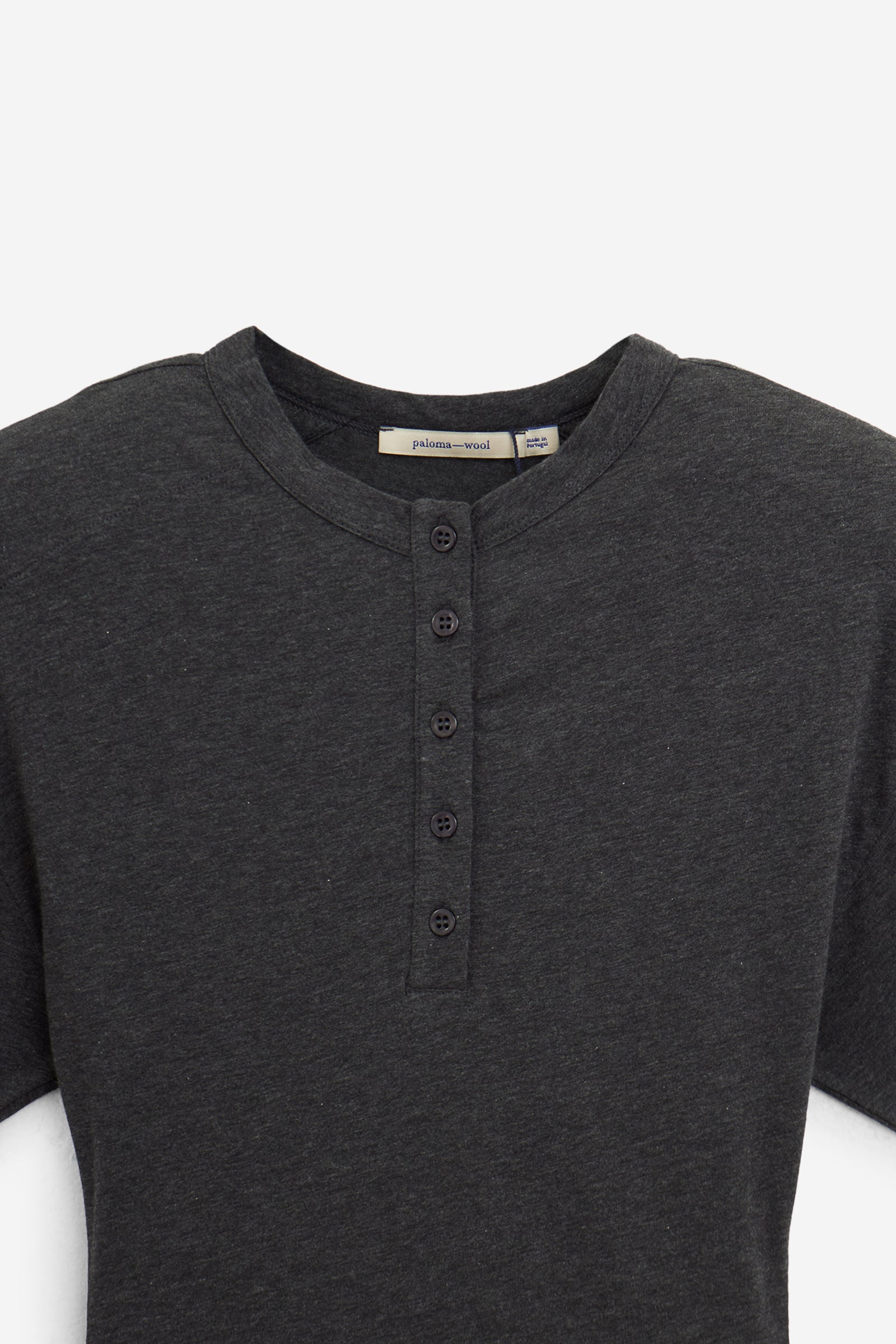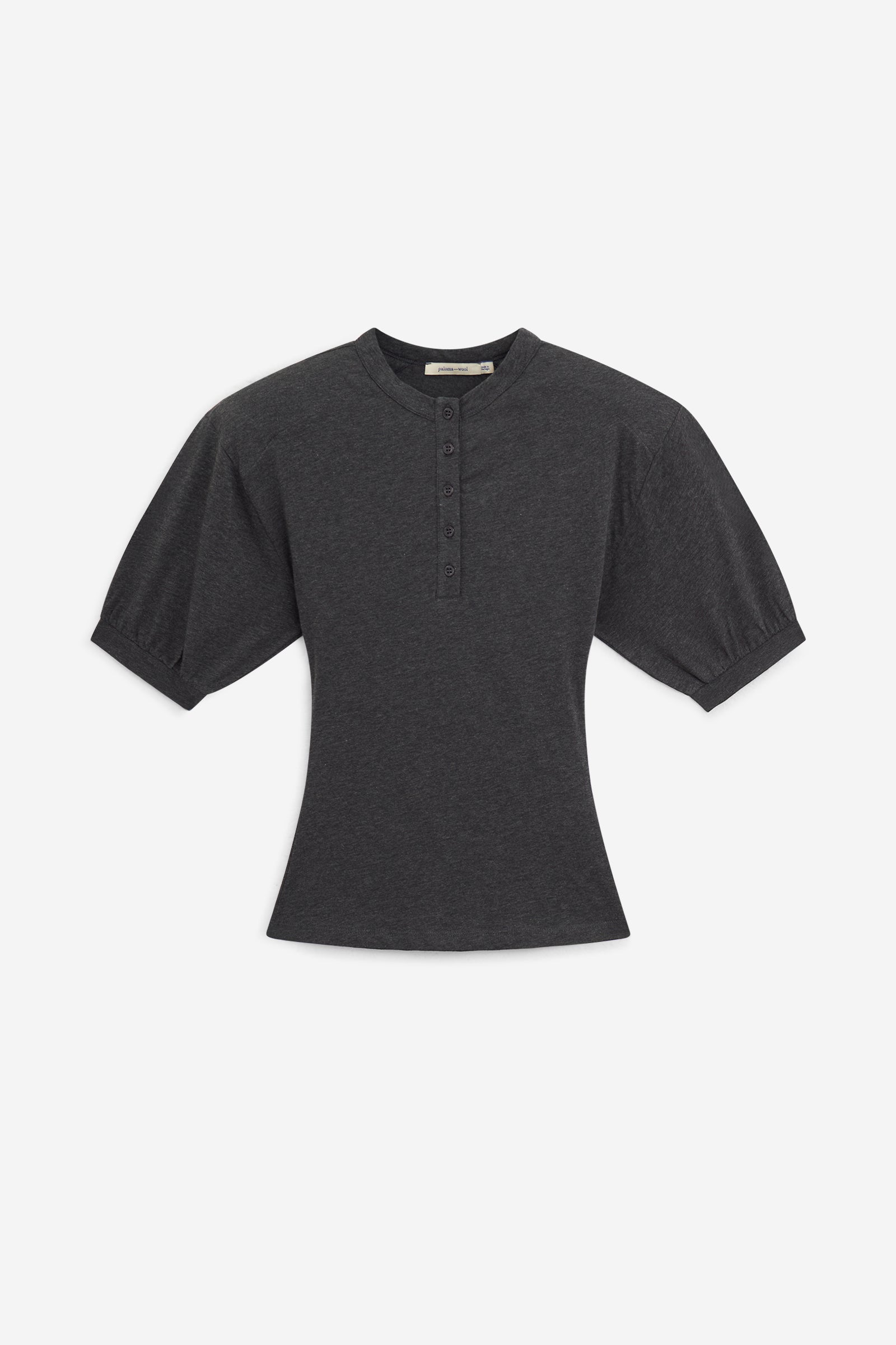 Top in cotone morbido e leggero a maniche corte con scollo henley e spalline removibili. Vestibilità aderente sul corpo con volume sulle maniche. Le spalline possono essere rimosse per il lavaggio o per modificare il look