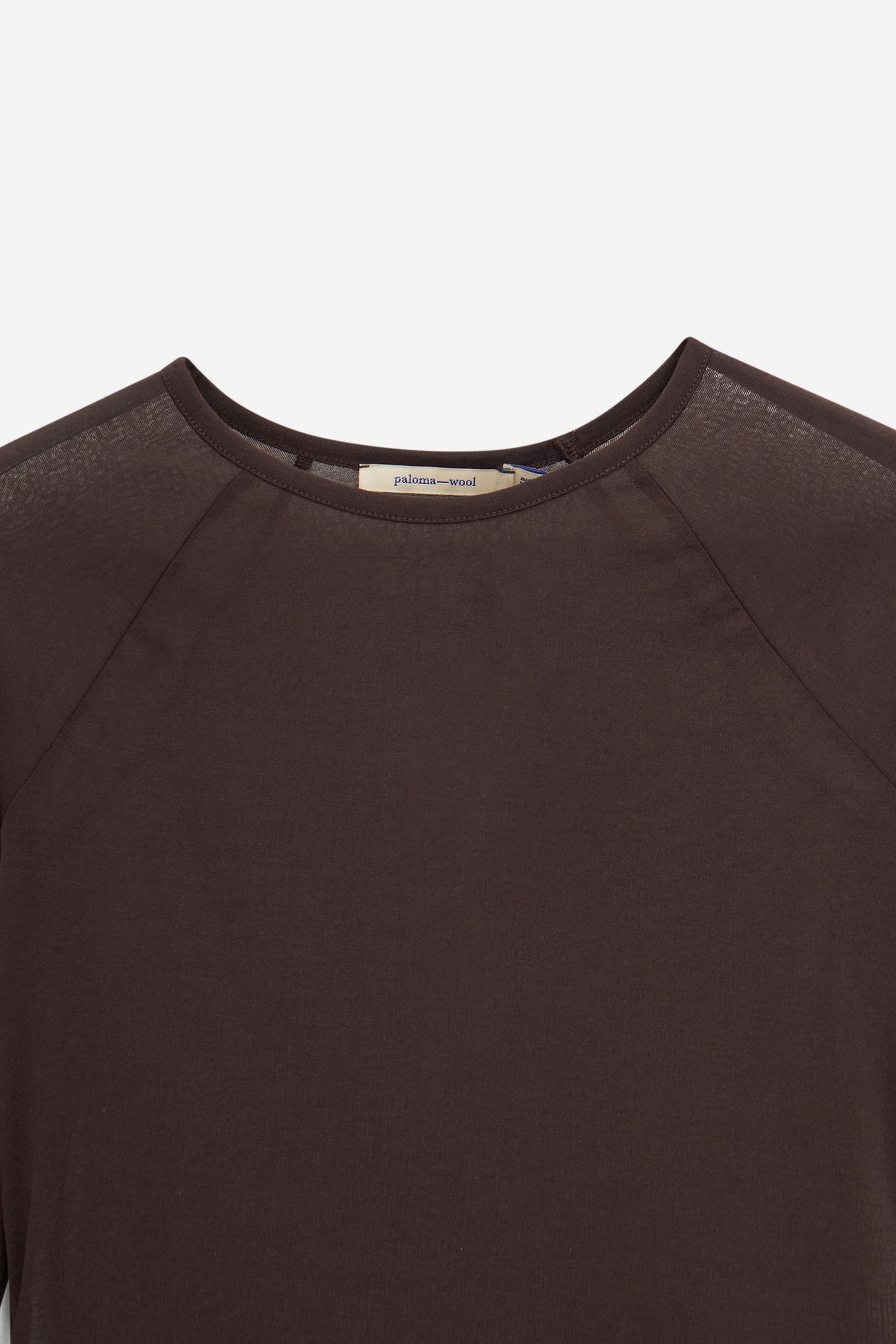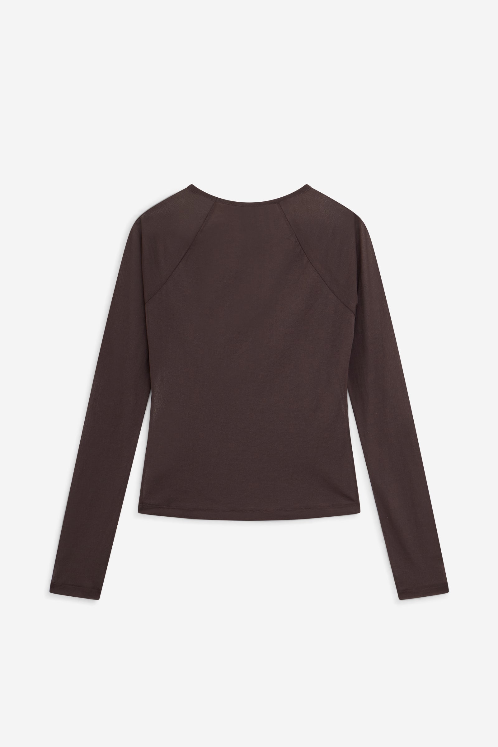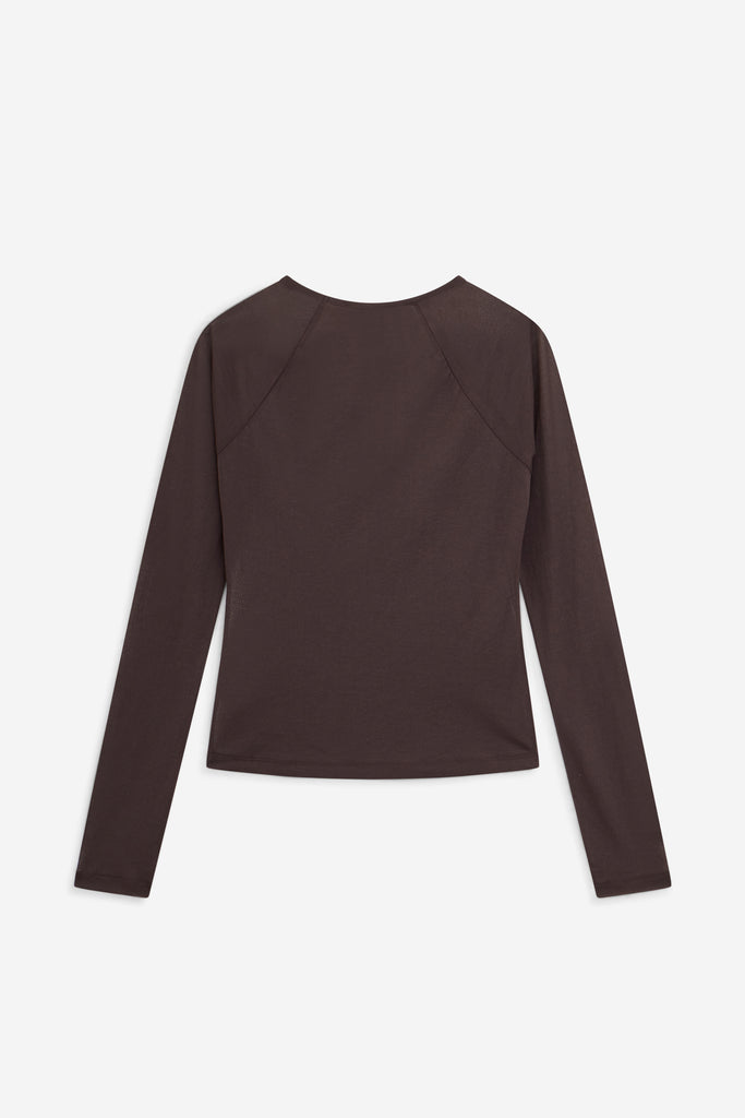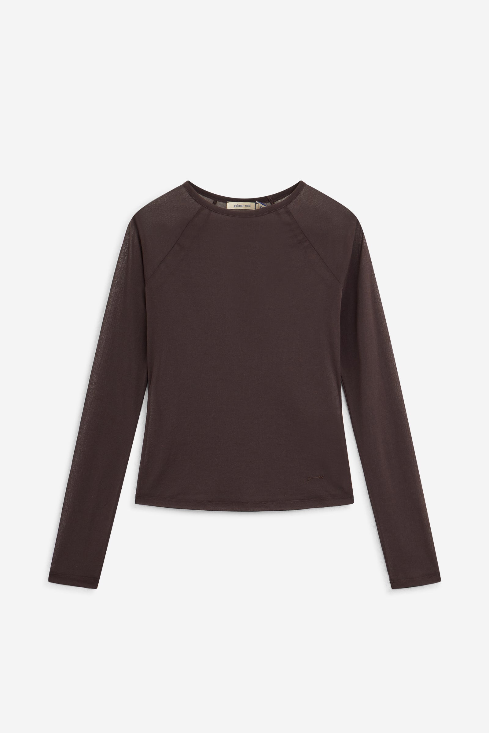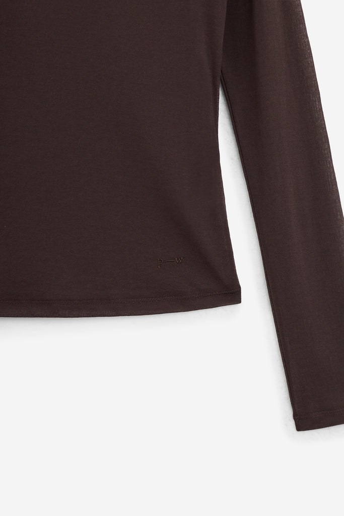 Top a maniche lunghe con giro manica raglan, vestibilità aderente, tessuto morbido al tatto, semi trasparente e simile al crêpe. Sul fondo a sinistra ha il dettaglio del ricamo PW tono su tono