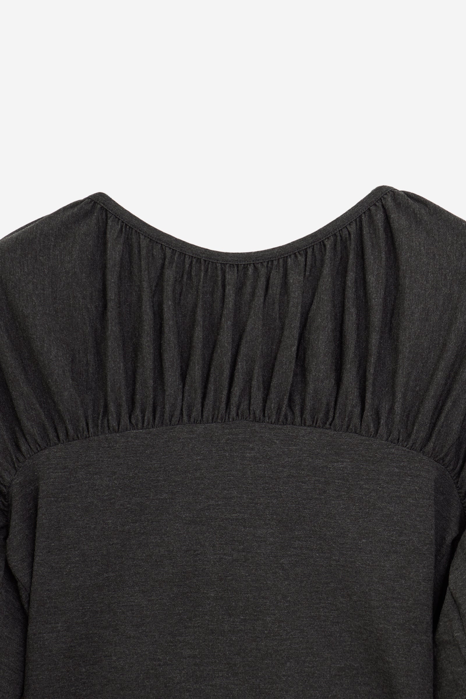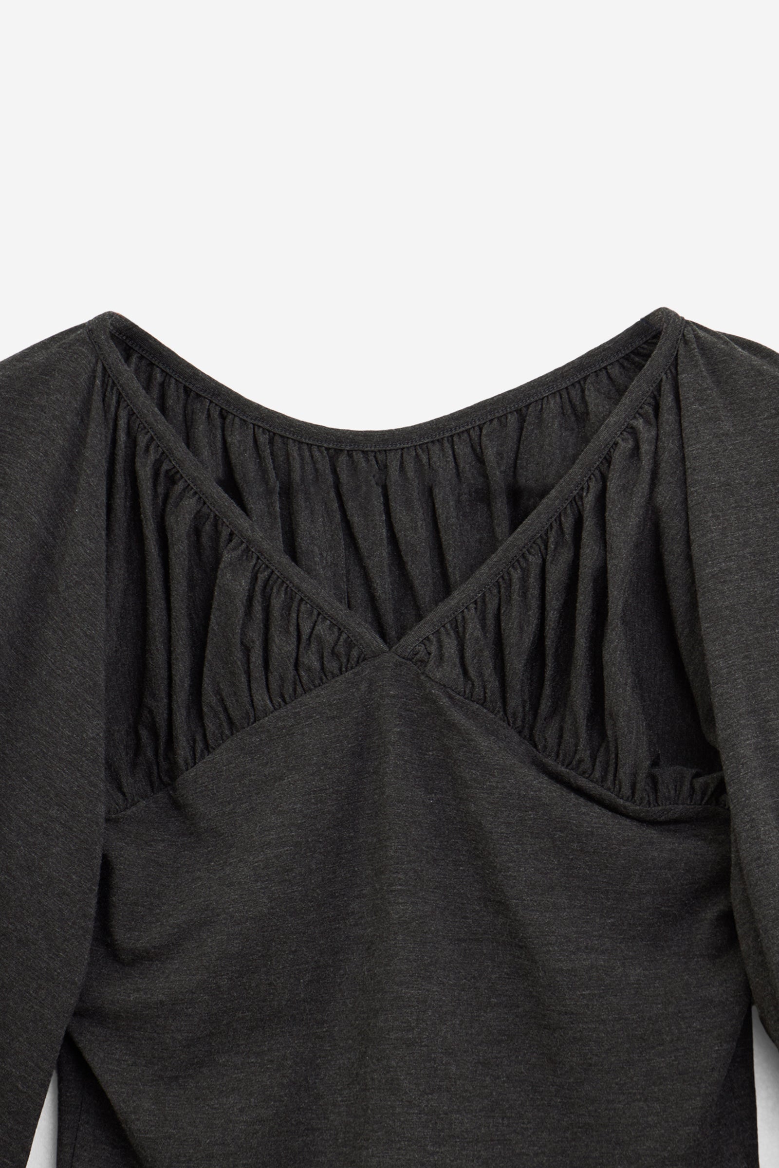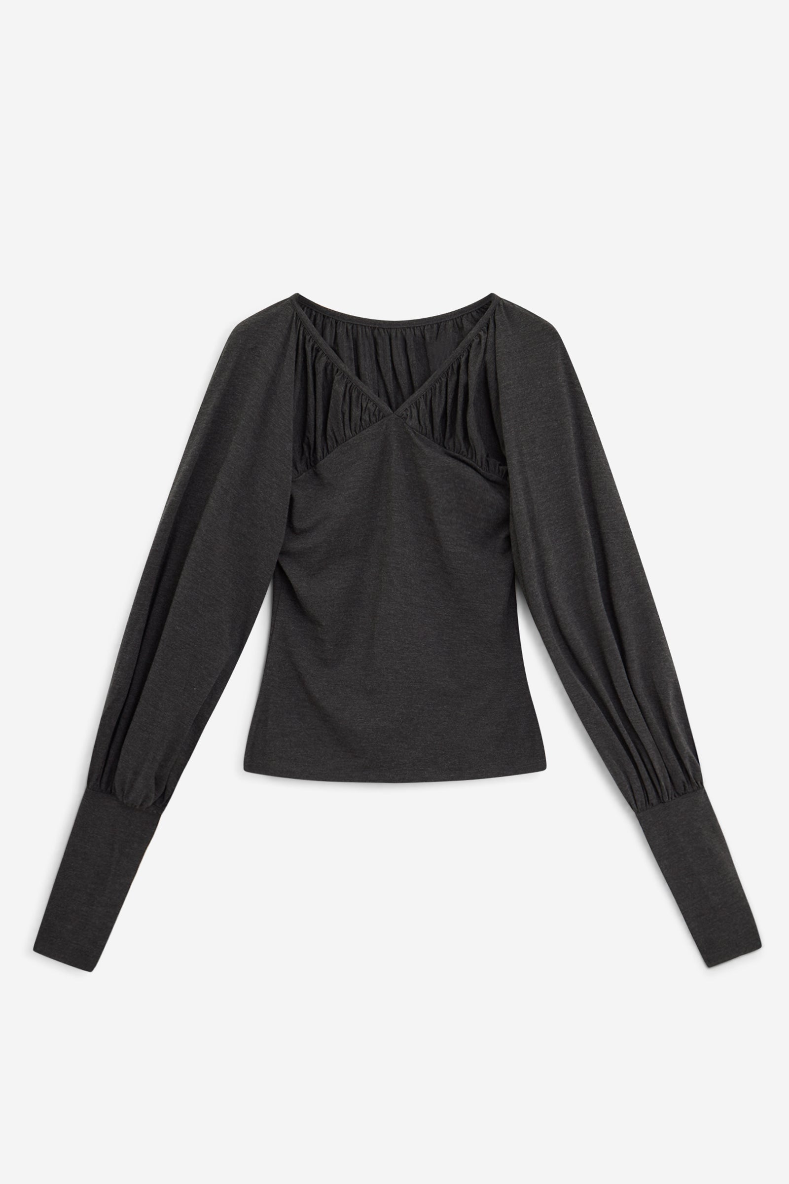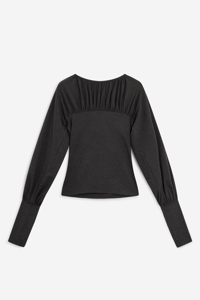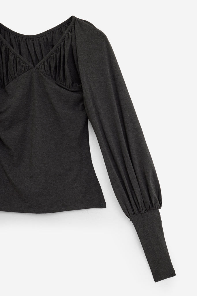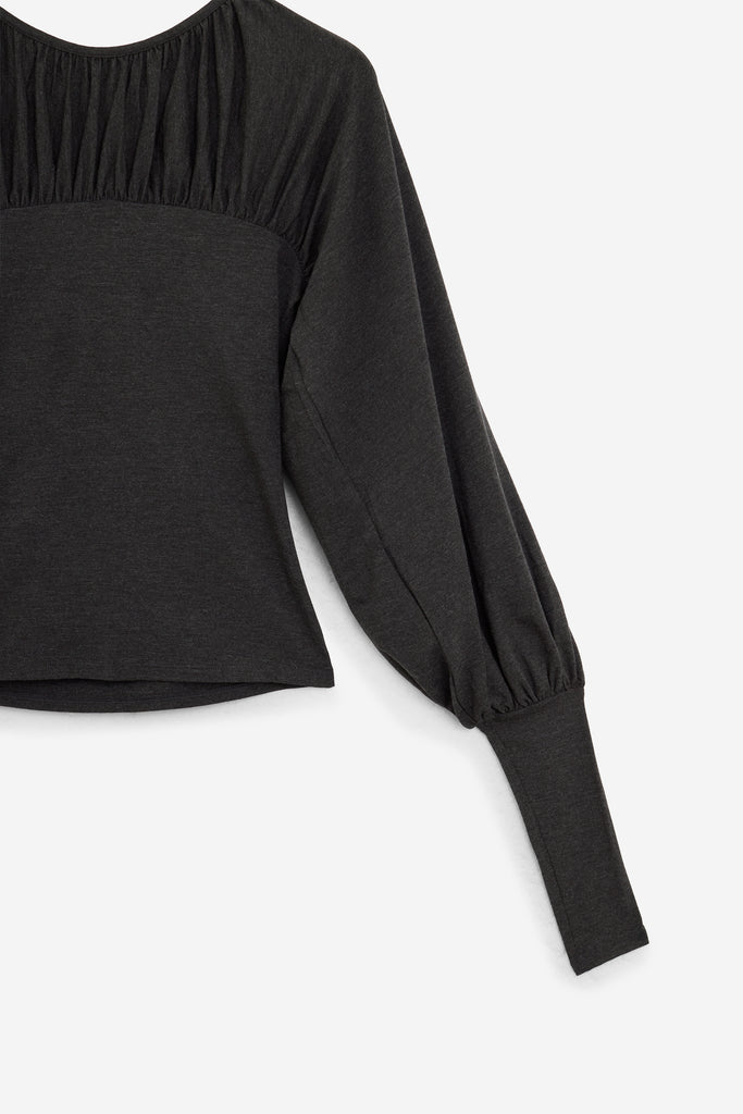 Top a maniche lunghe con corpo aderente e maniche voluminose, rifinito con polsini lunghi aderenti. Realizzato in micromodal elasticizzato opaco. Reversibile davanti e dietro, con un lato con scollo rotondo e l'altro con scollo a V