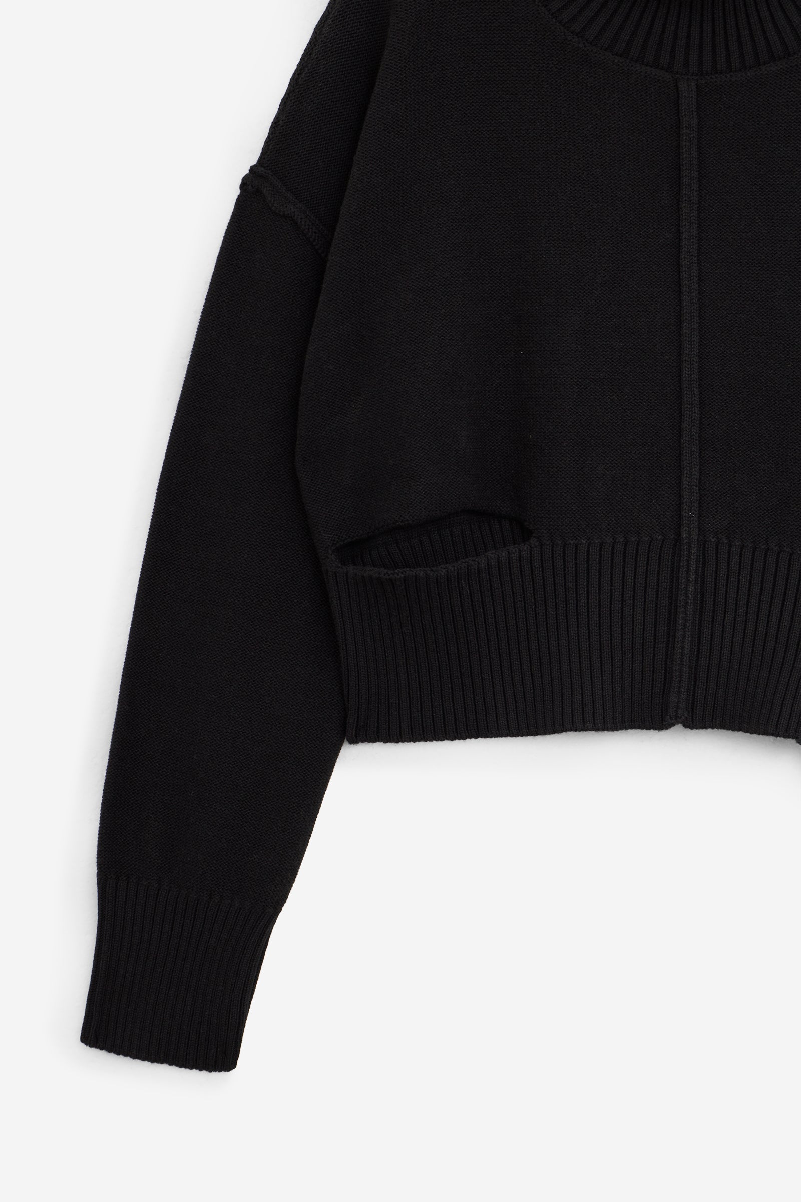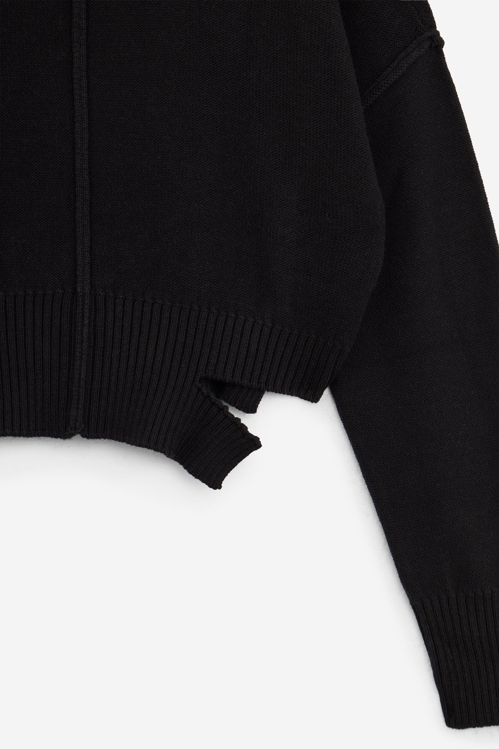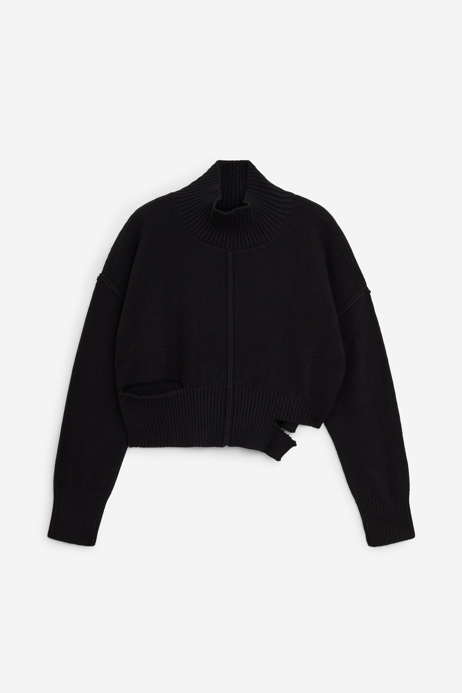 Maglione a collo alto in misto lana, con effetti di usura, cuciture a vista, spalla scesa, dettagli strappati e bordi a coste. Sul retro si trova la firma discreta ma inconfondibile di MM6, una linea orizzontale di impunture bianche.