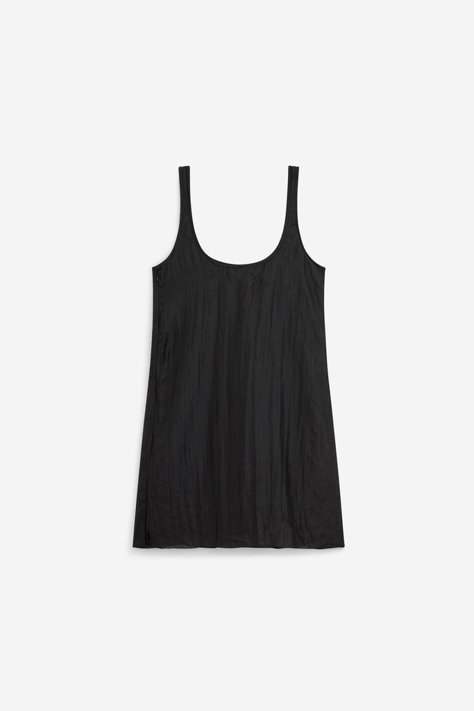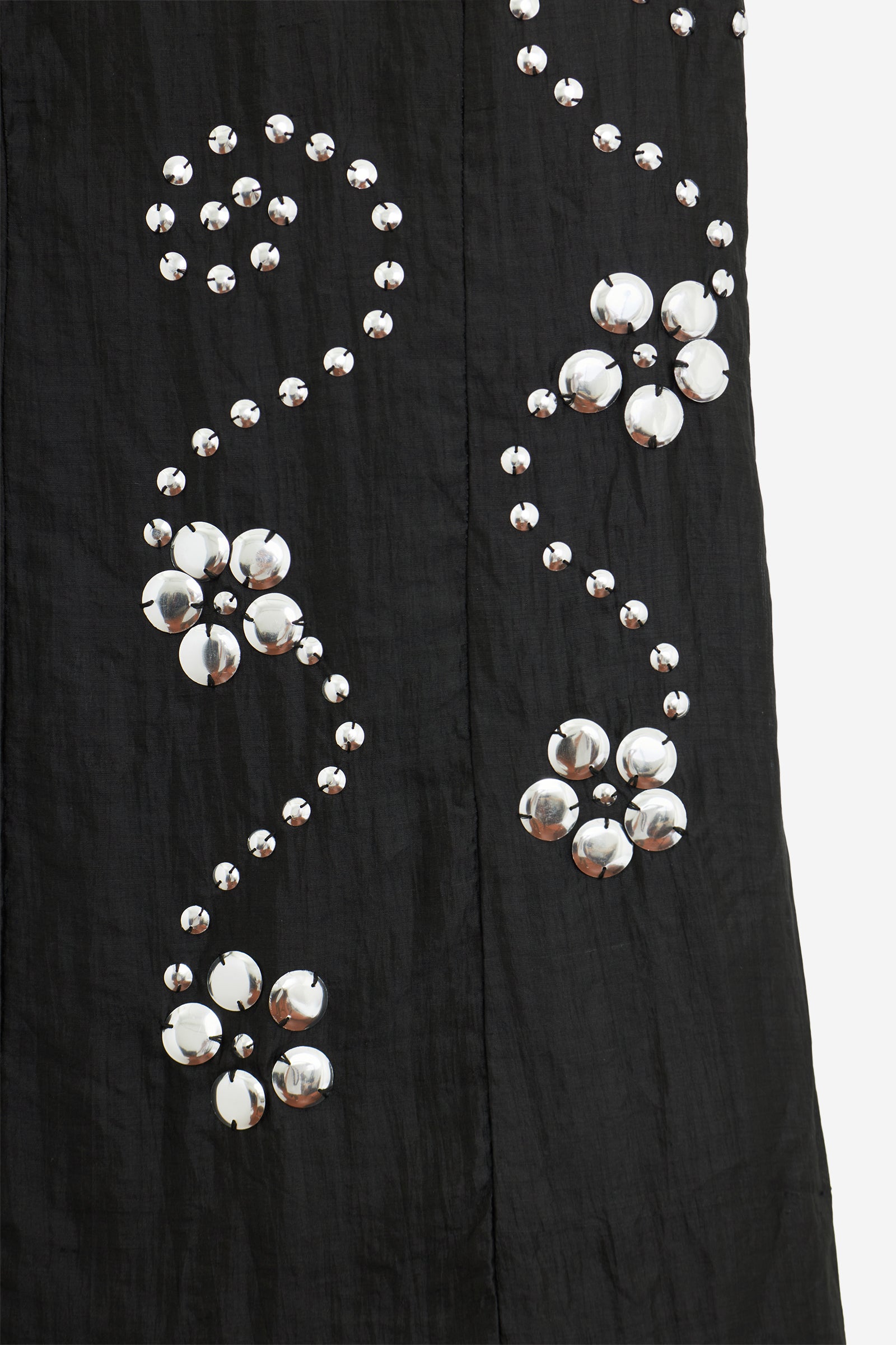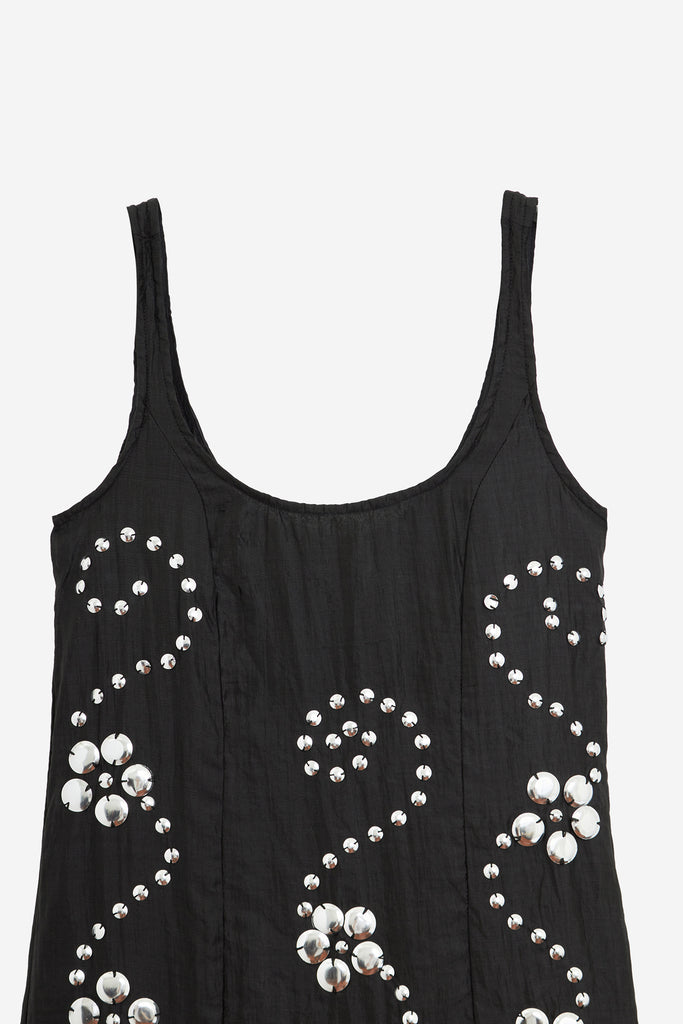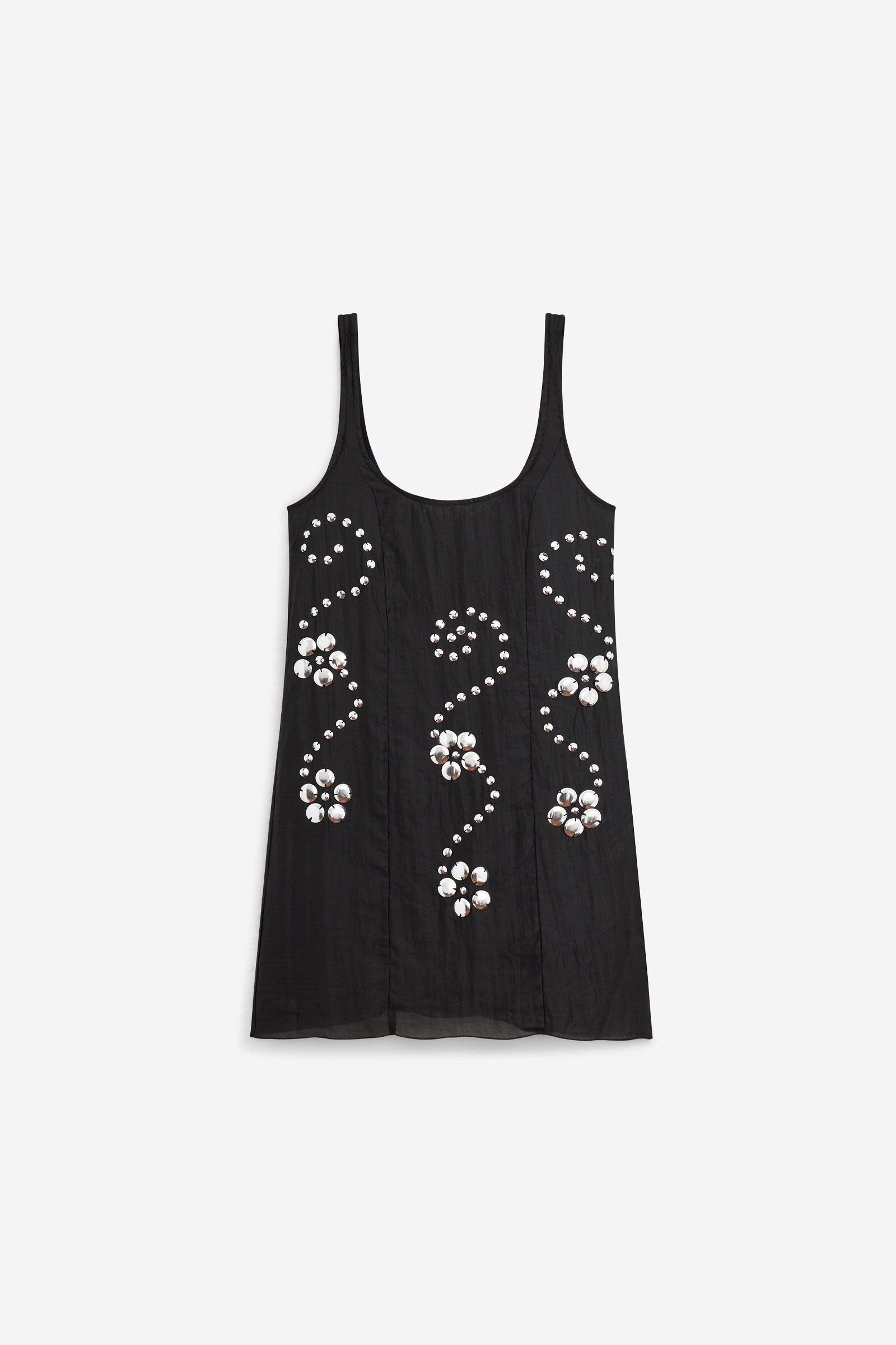 Miniabito nero senza maniche, il design è impreziosito da paillettes floreali color argento. Lo scollo è rotondo. La silhouette è dritta con una leggera svasatura sul fondo