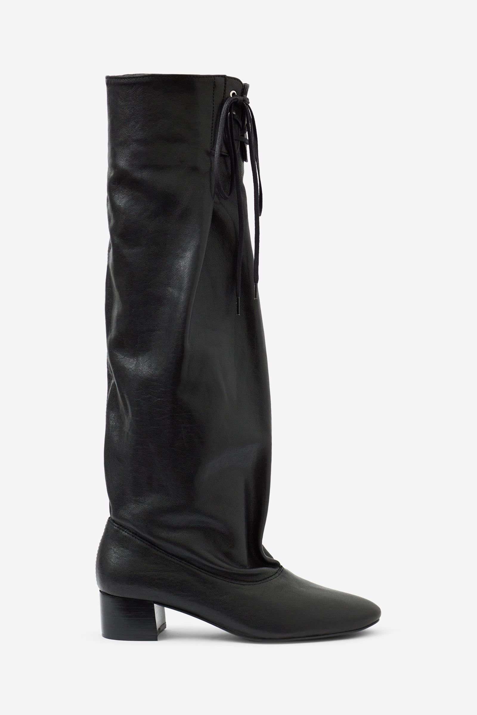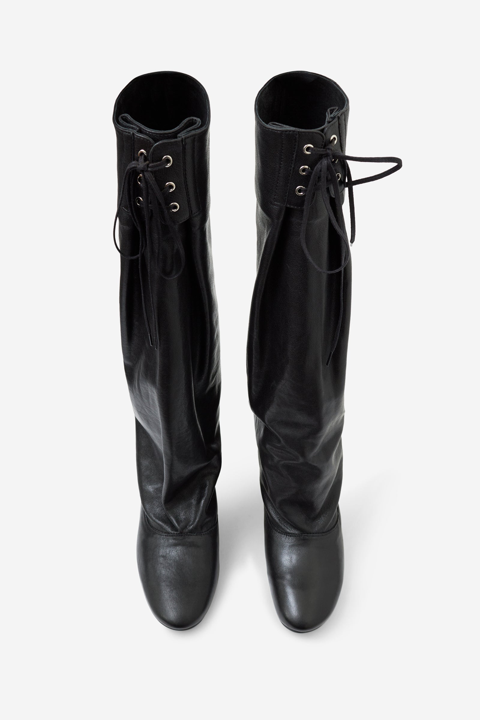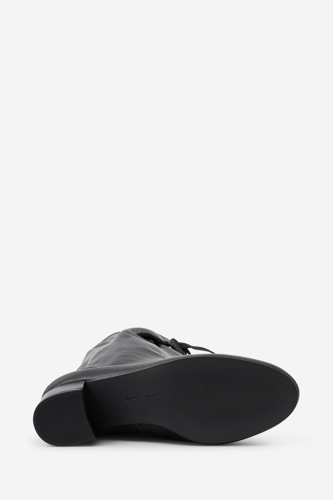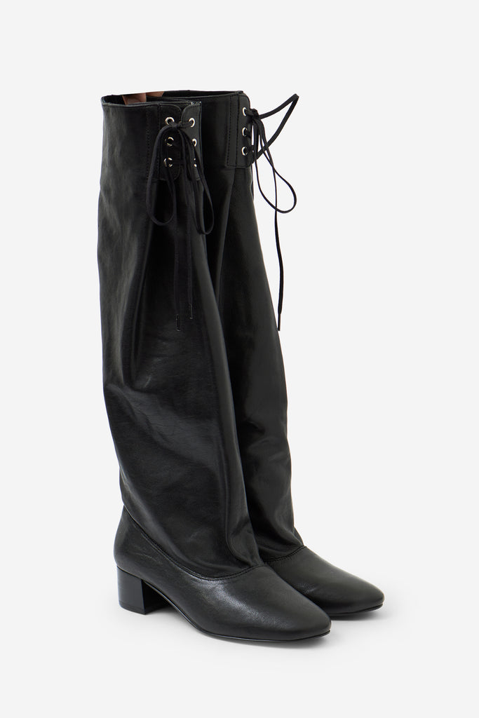 Stivale con gambale largo senza fodera né cerniera, rifinito con lacci nella parte superiore anteriore del gambale. La pelle utilizzata per questo modello ha un aspetto leggermente lucido e gli dona morbidezza e comodità, colore nero.