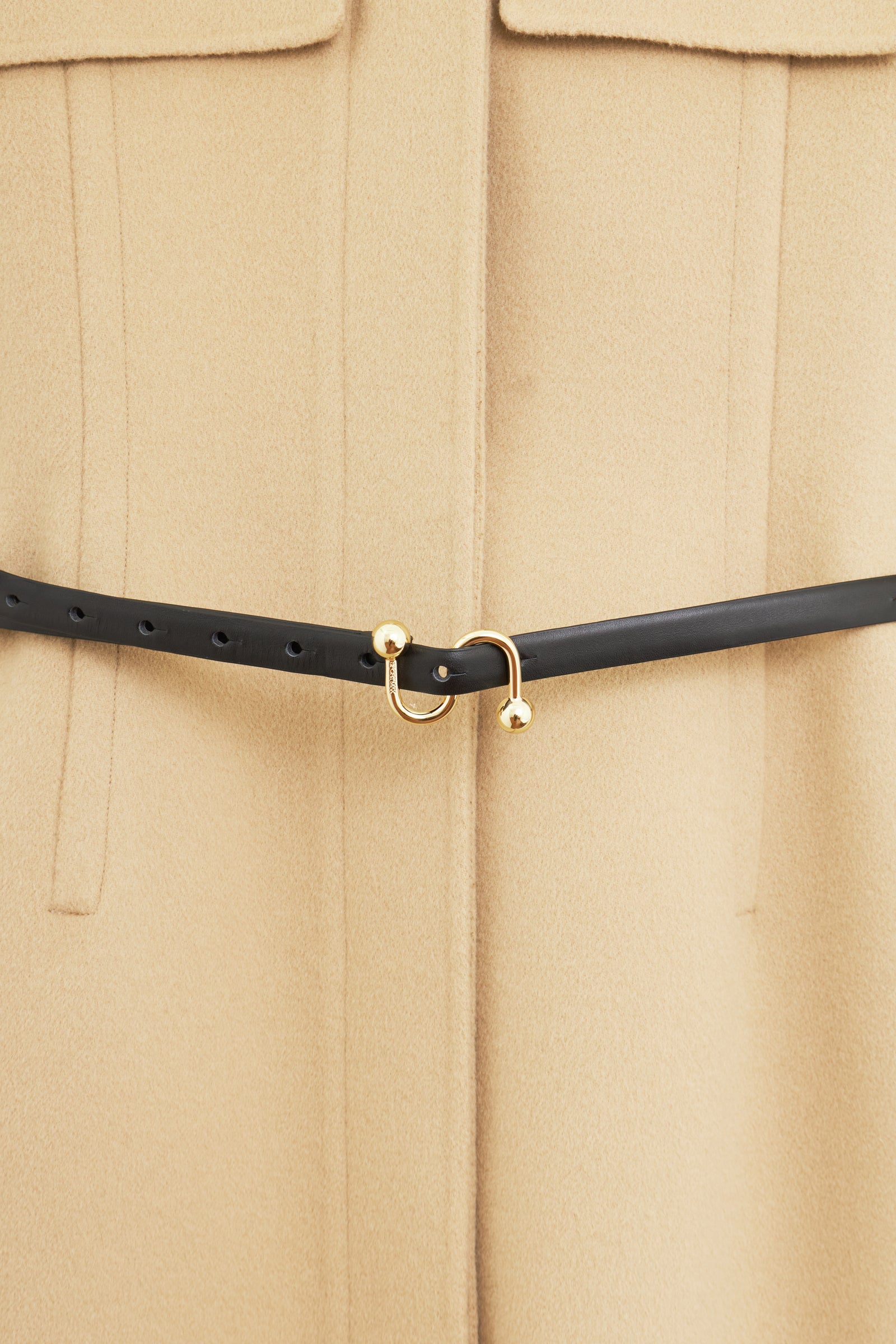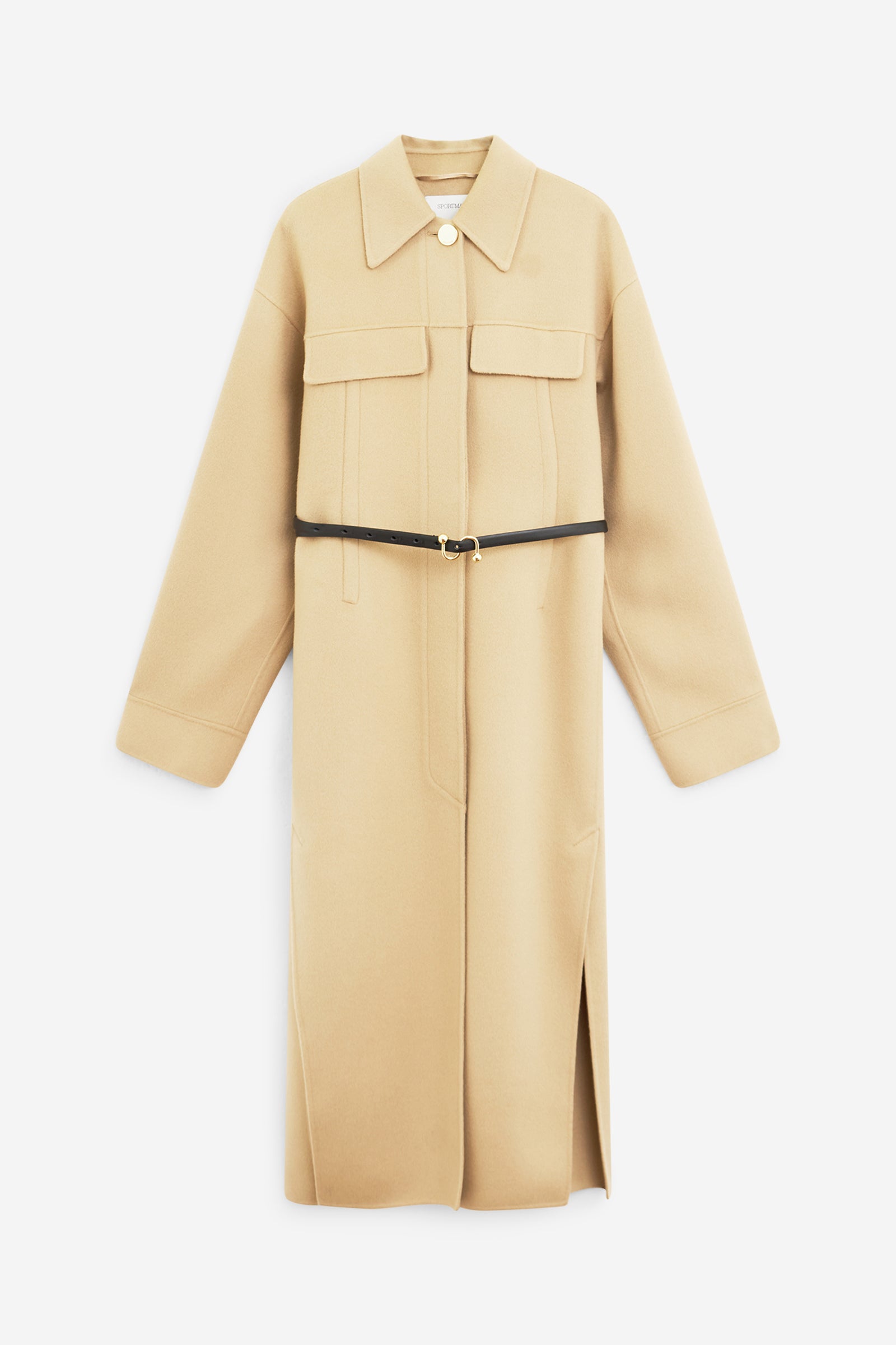 Cappotto OLIO in Lana Cammello, colletto classico, maniche lunghe, tasche frontali, lunghezza alla caviglia, modello con cintura