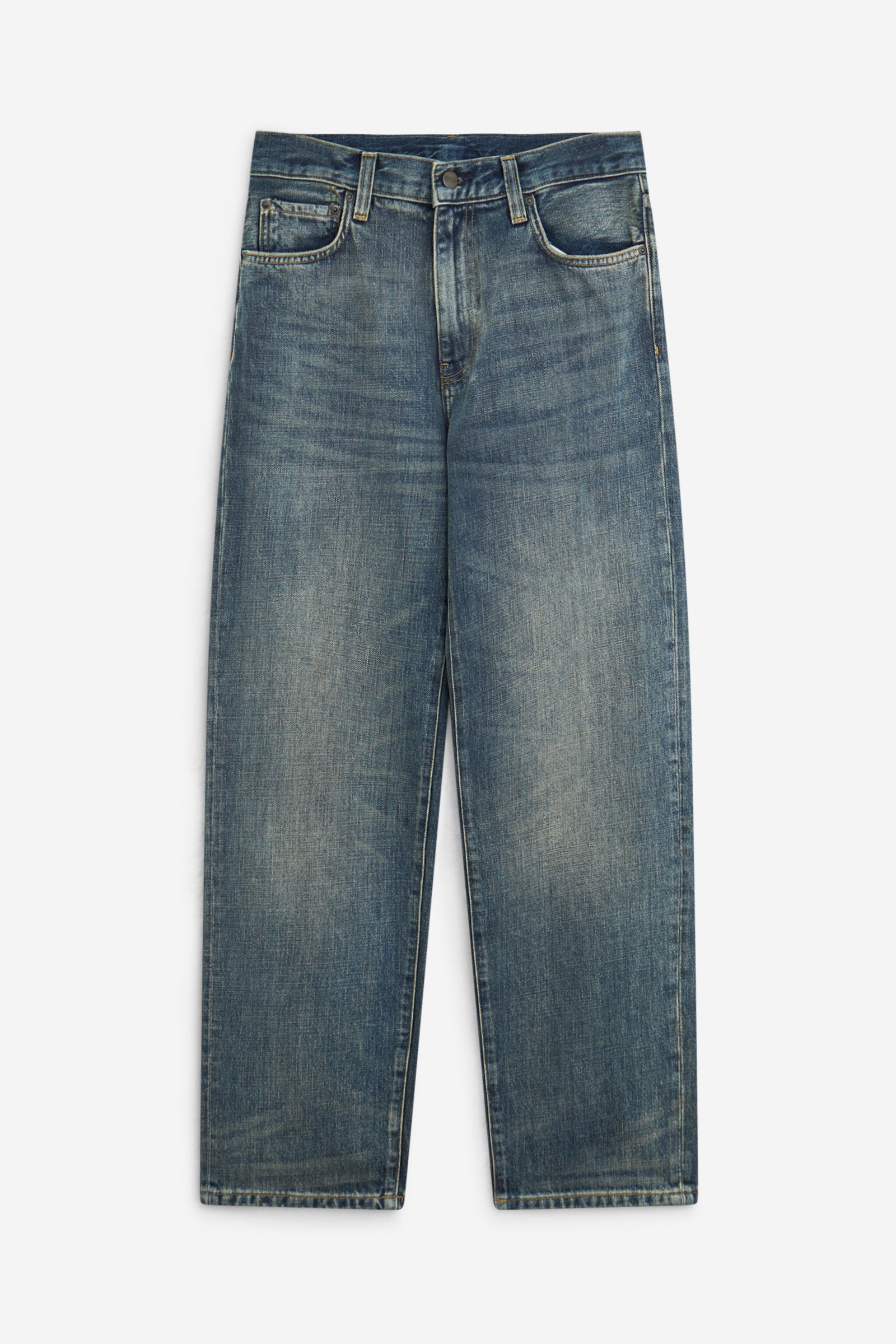 Gli Aaron Pant sono un modello a cinque tasche realizzato in denim di cotone pesante e caratterizzato da vestibilità normale e gamba affusolata. Sono inoltre caratterizzati da una resistente impuntura a travetta e da rivetti nei punti di maggior usura. Sulla tasca posteriore compare un’etichetta quadrata in pelle sintetica.