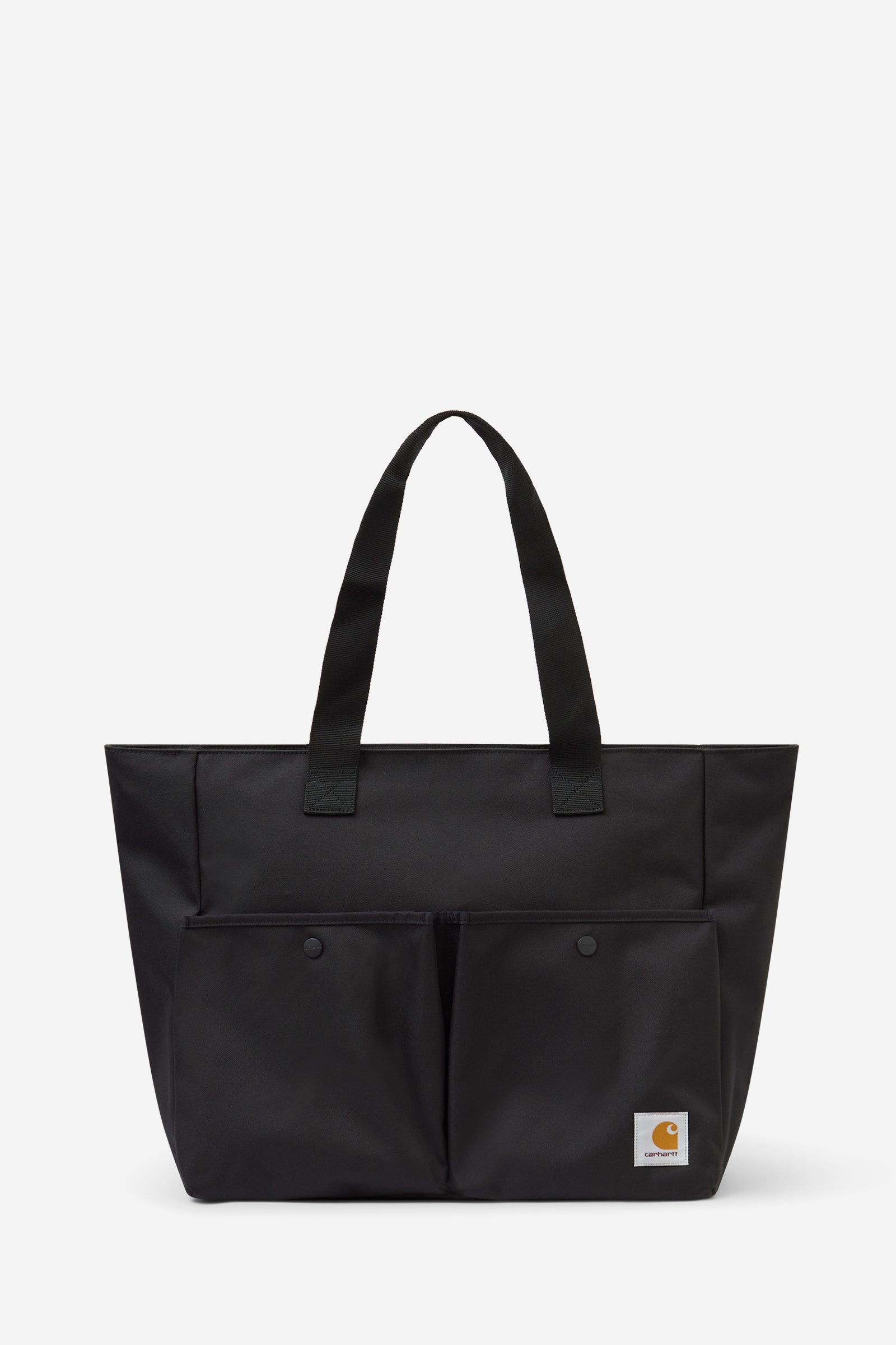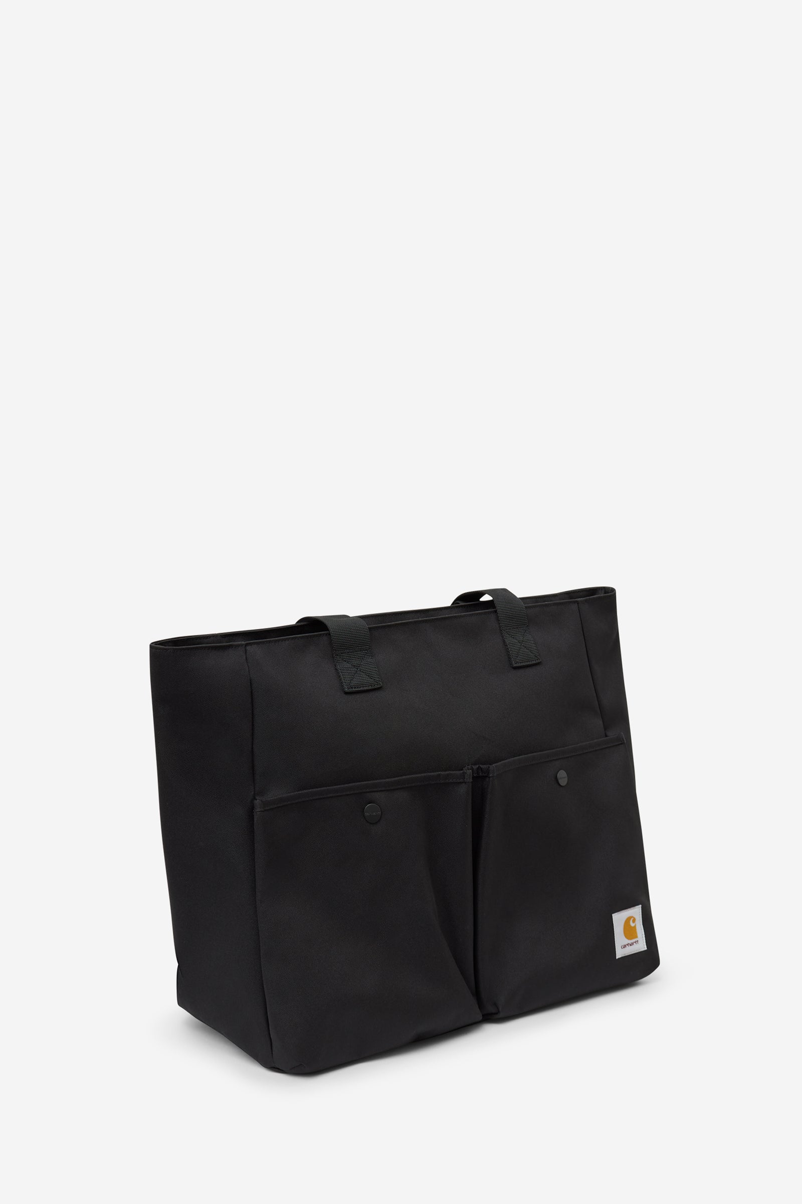 JAKE TOTE handbag in black polyester, shoulder strap, logo on the front, front pockets