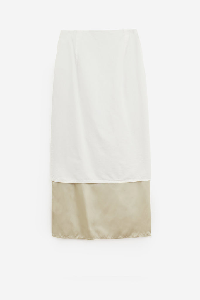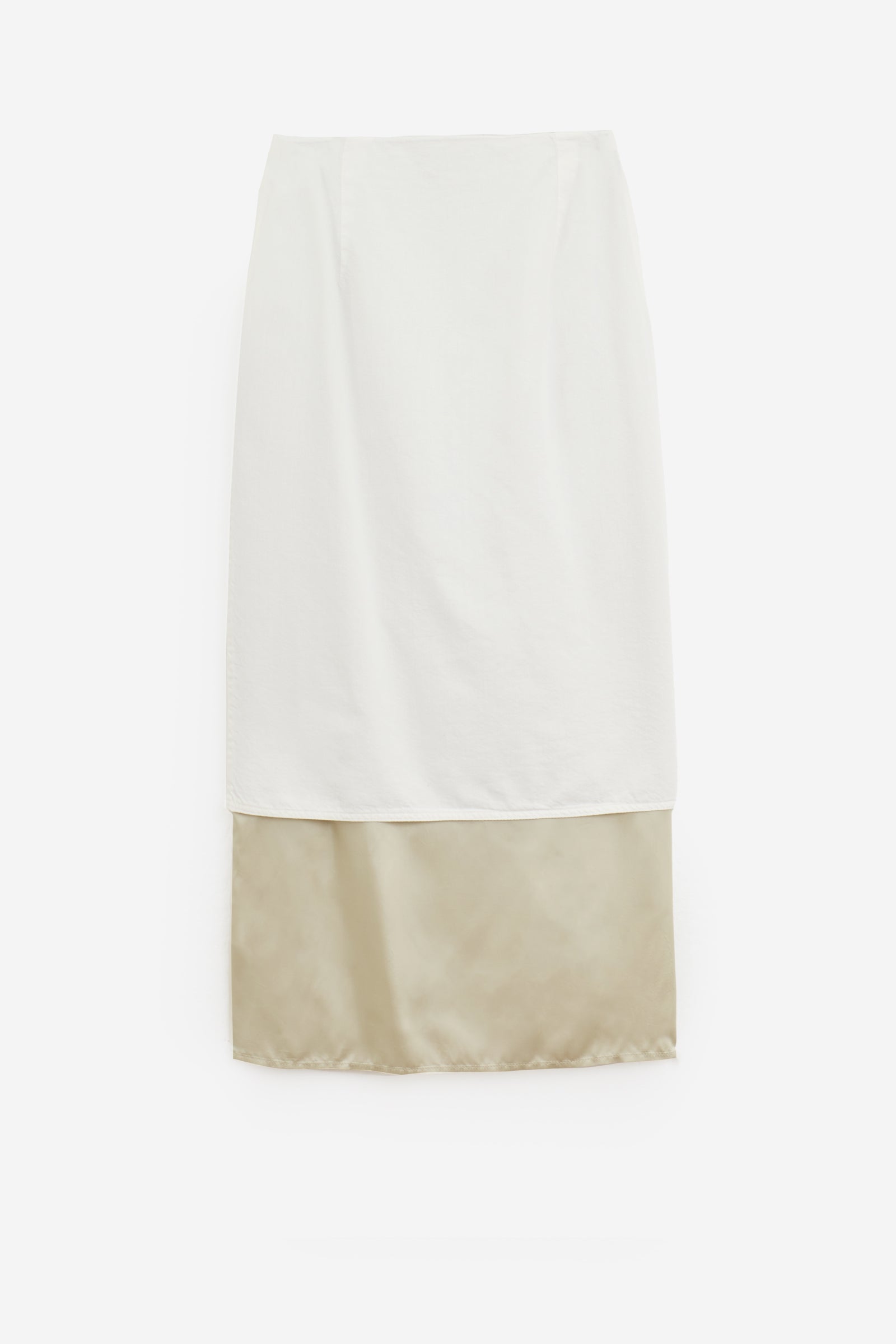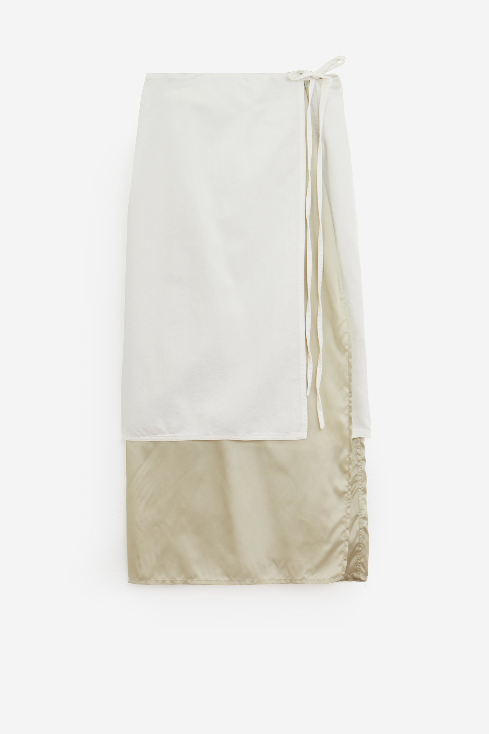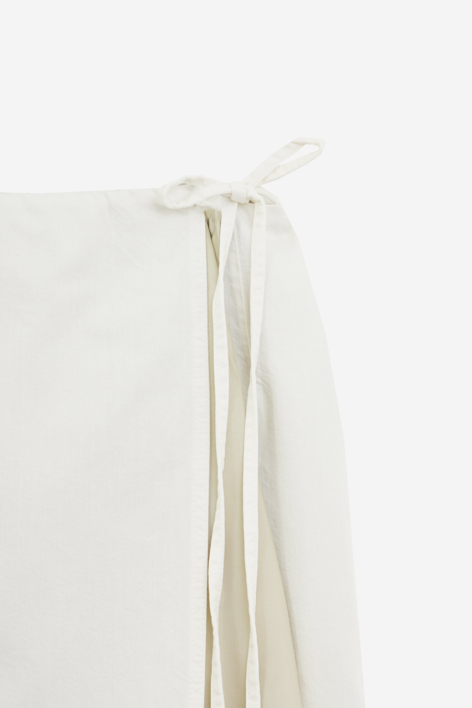 SILENE DENIM skirt in white cotton, side knot closure, calf length, wrap design