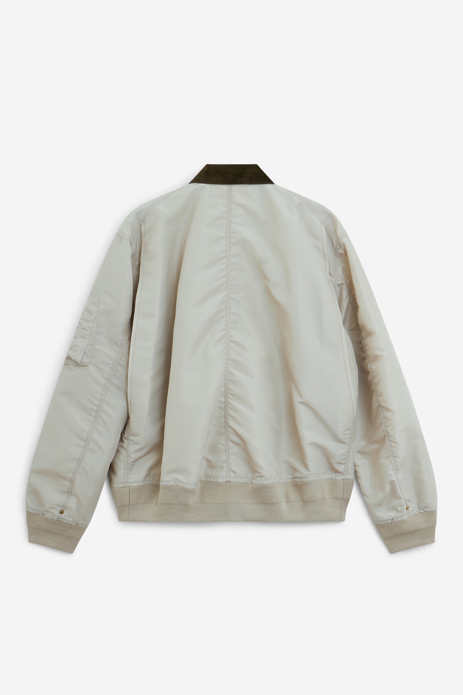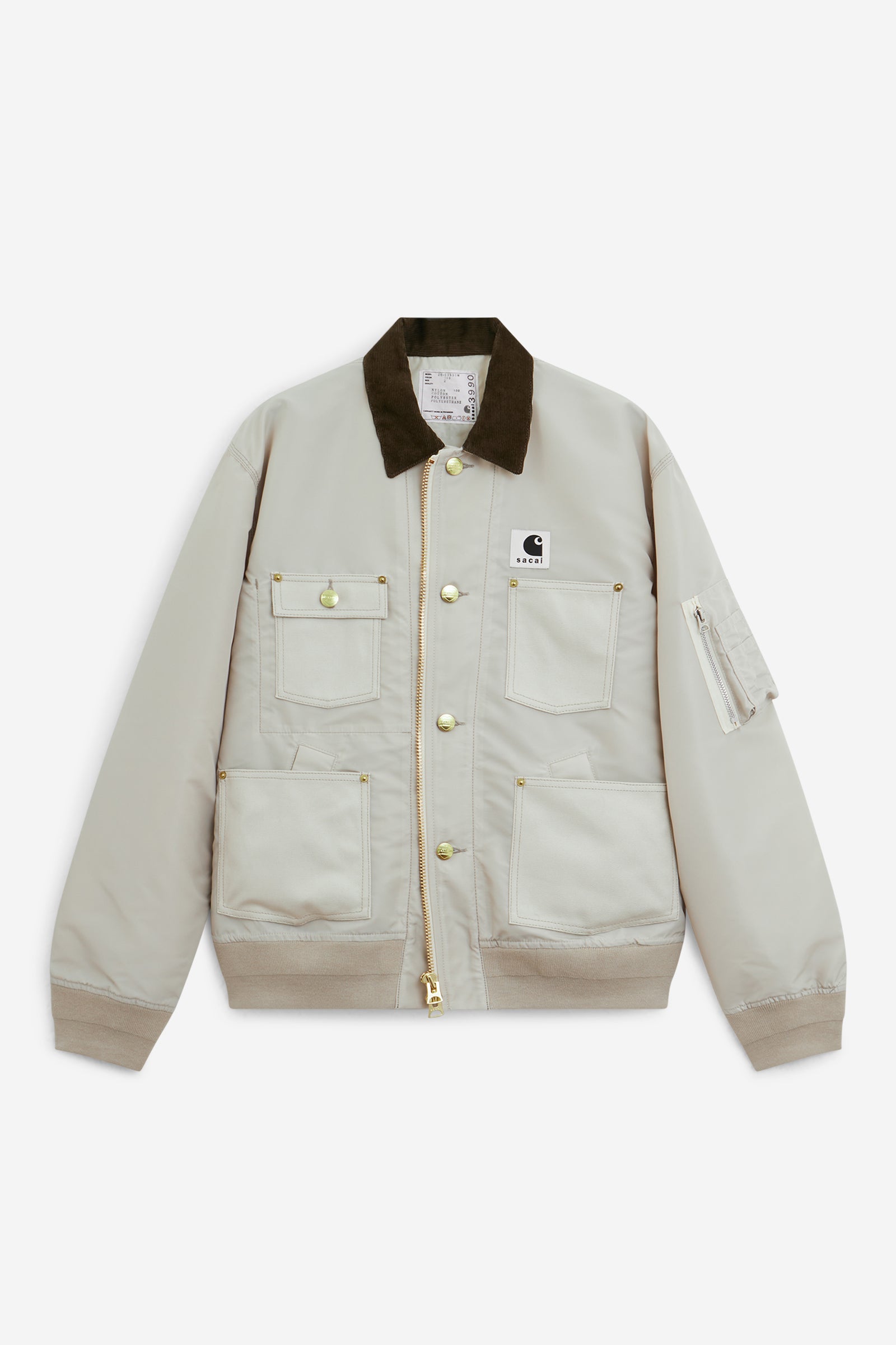 Il blouson in twill di nylon sacai x Carhartt WIP combina la silhouette del blouson MA-1 di sacai con elementi del Chore Coat di Carhartt WIP. Il capo è realizzato in twill di nylon sacai e presenta quattro tasche in tela Dearborn e un collo in velluto a coste, ispirato al Chore Coat di Carhartt WIP. La giacca è inoltre impreziosita da cuciture tono su tono. La parte anteriore presenta due chiusure: una chiusura con bottoni che richiama il Chore Coat e una chiusura con zip che si ispira al blouson MA-1 di sacai. Un'etichetta tessuta con marchio congiunto completa il design.
