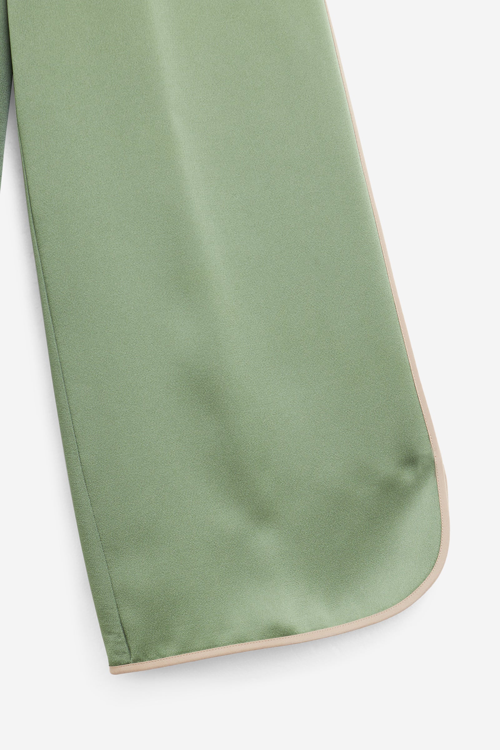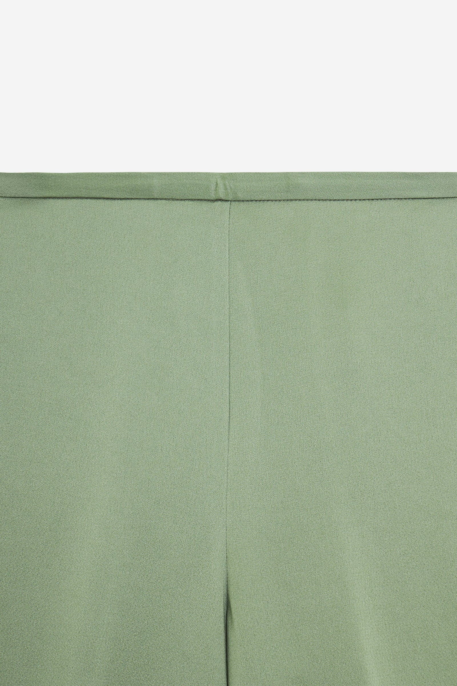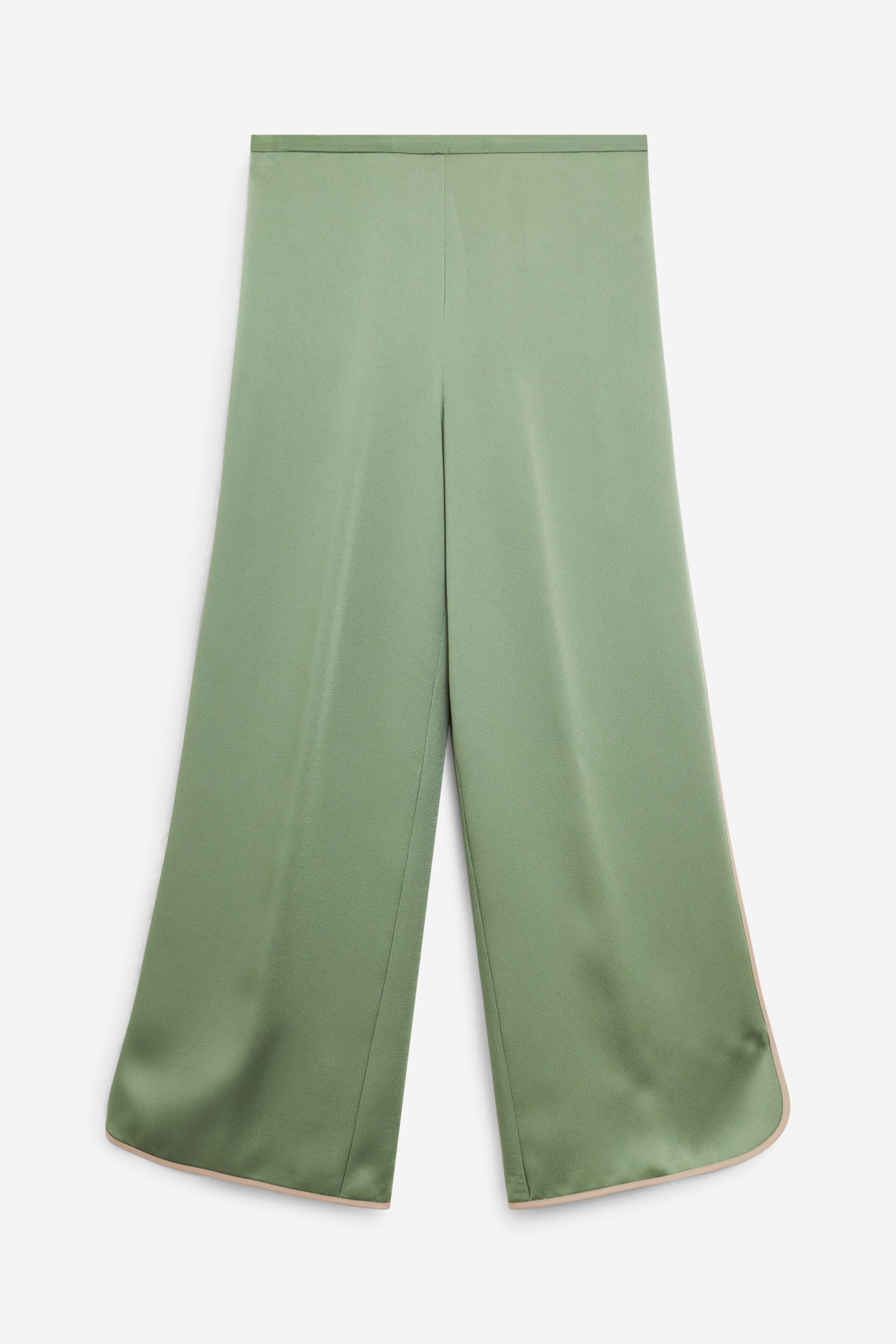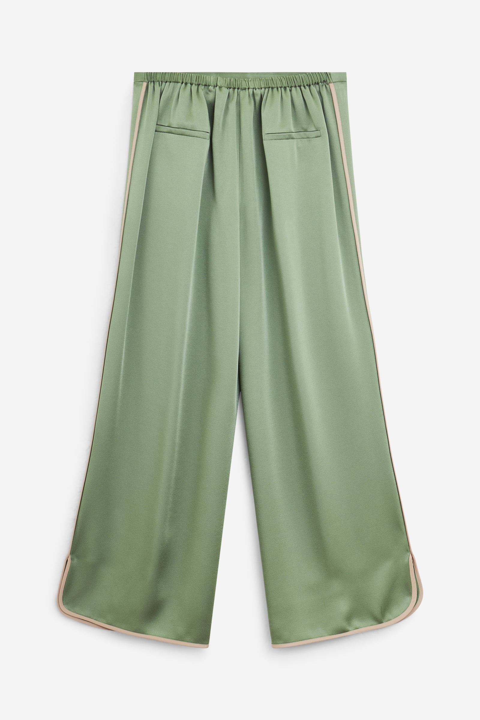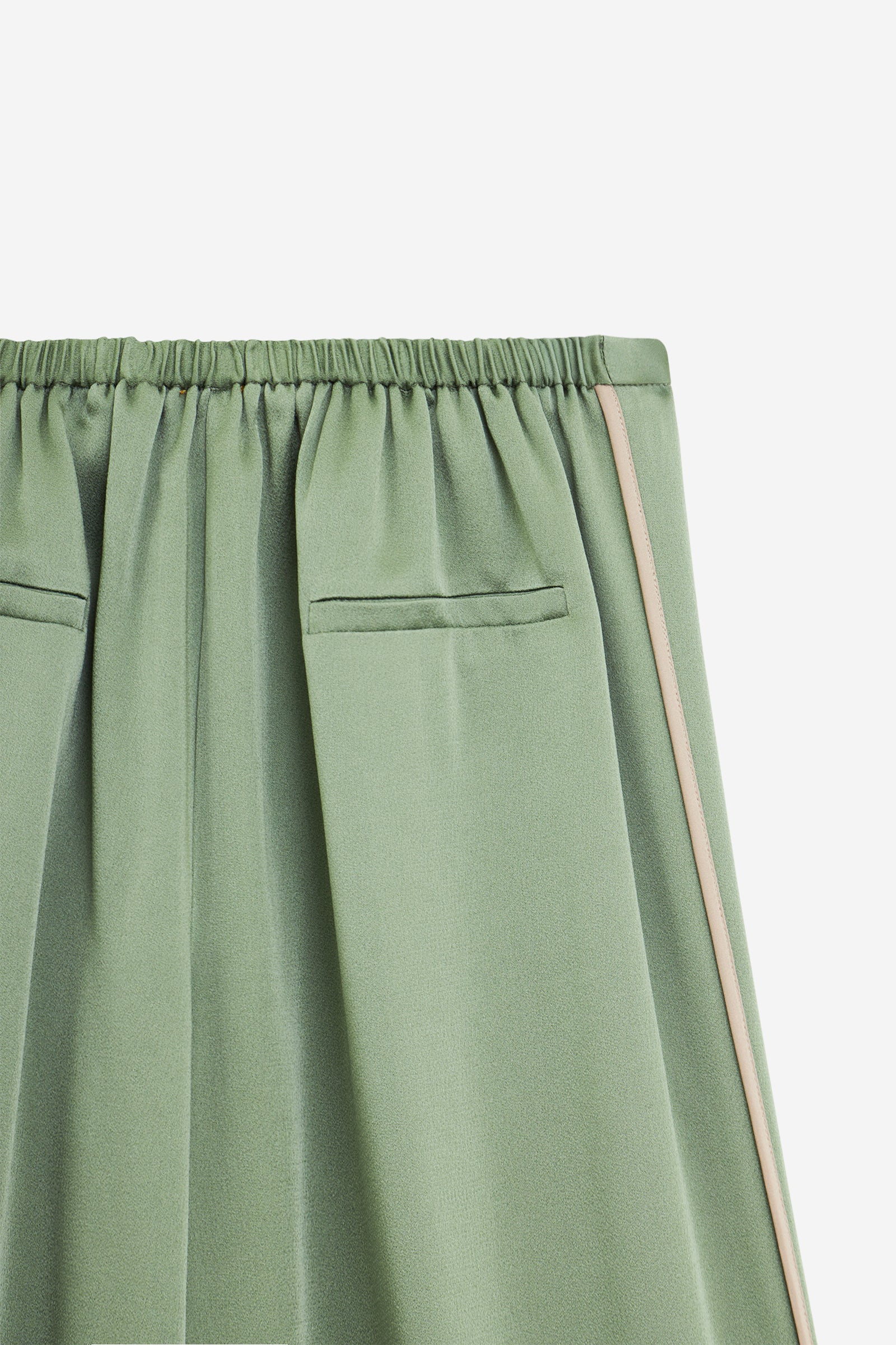 Pantalone in envers satin, fluido e ondeggiante sulla gamba. La costruzione con flat front e inserto elastico sul retro della vita offre una linea pulita ma confortevole.