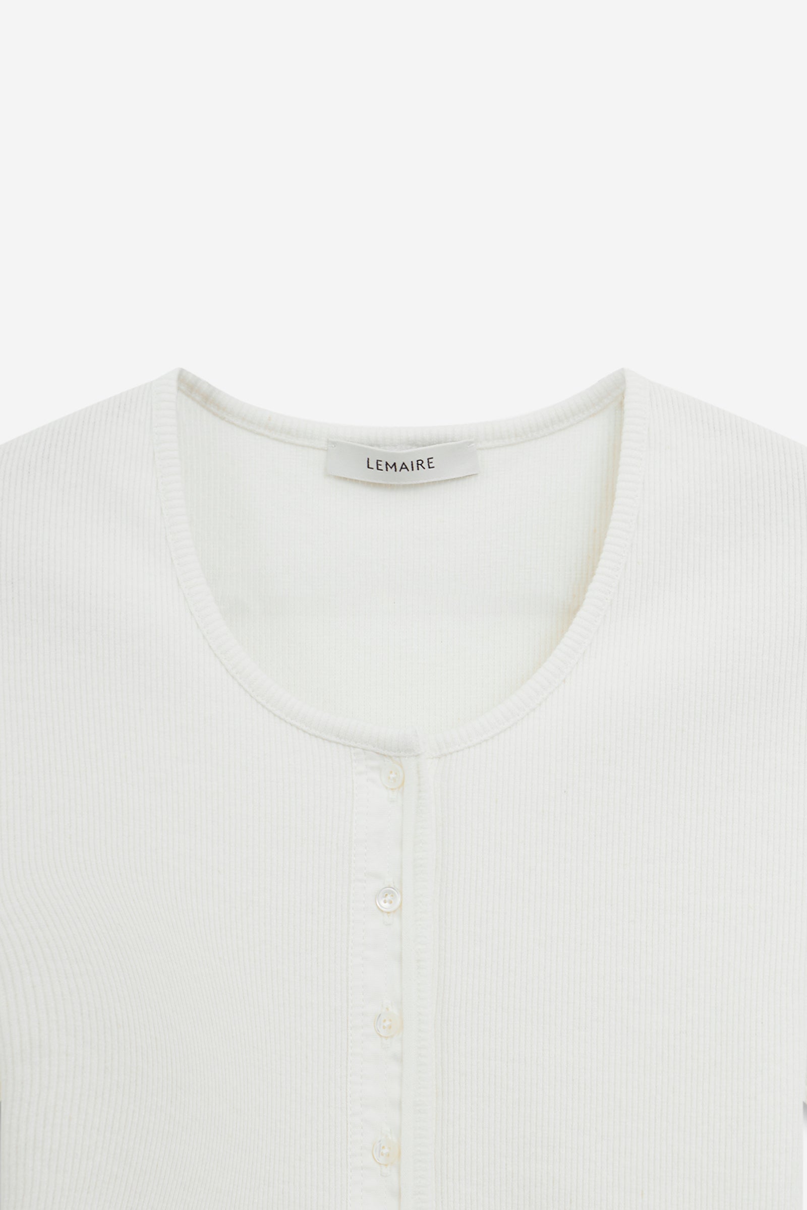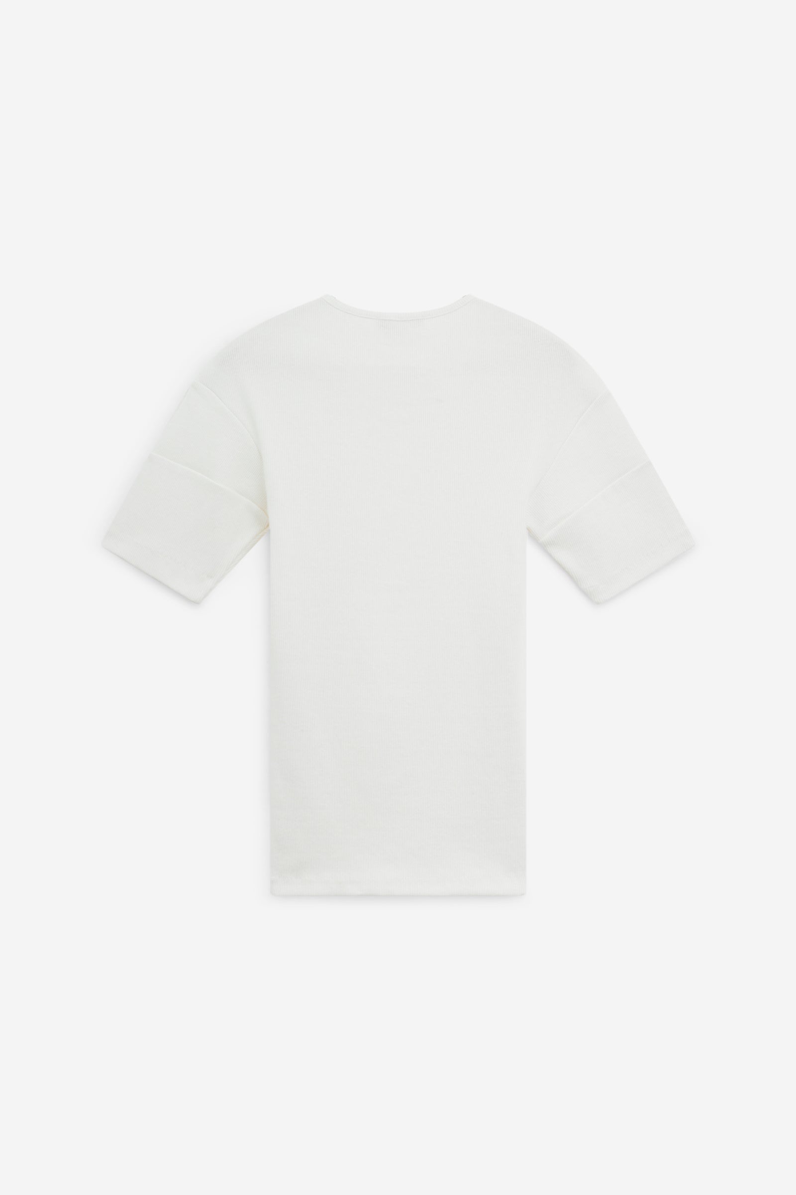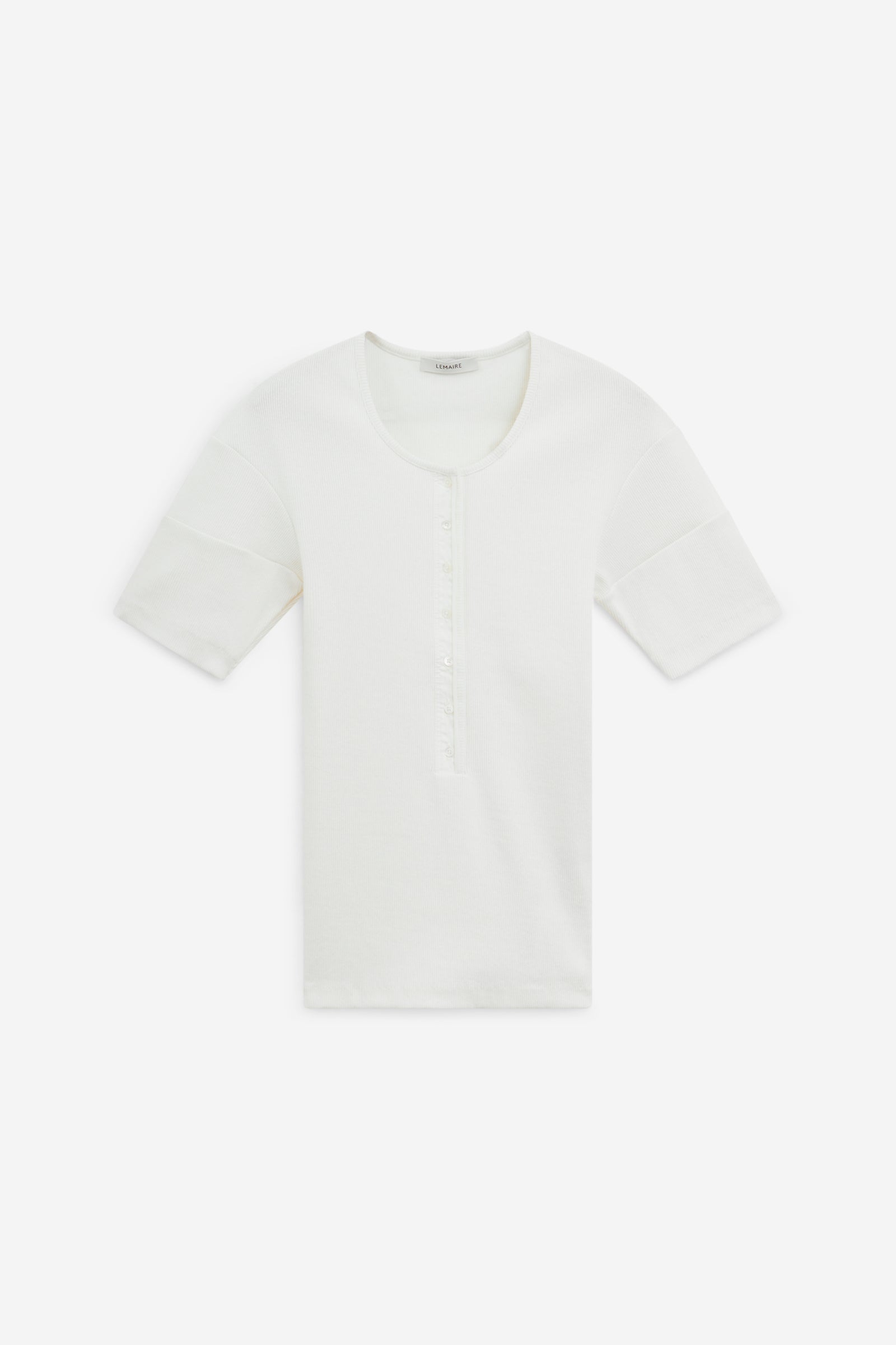 T-shirt a costine in cotone e lino, presenta uno scollo rotondo con chiusura a bottoni in madreperla e tessuto a contrasto. La manica corta è realizzata con pieghe effetto 3D.