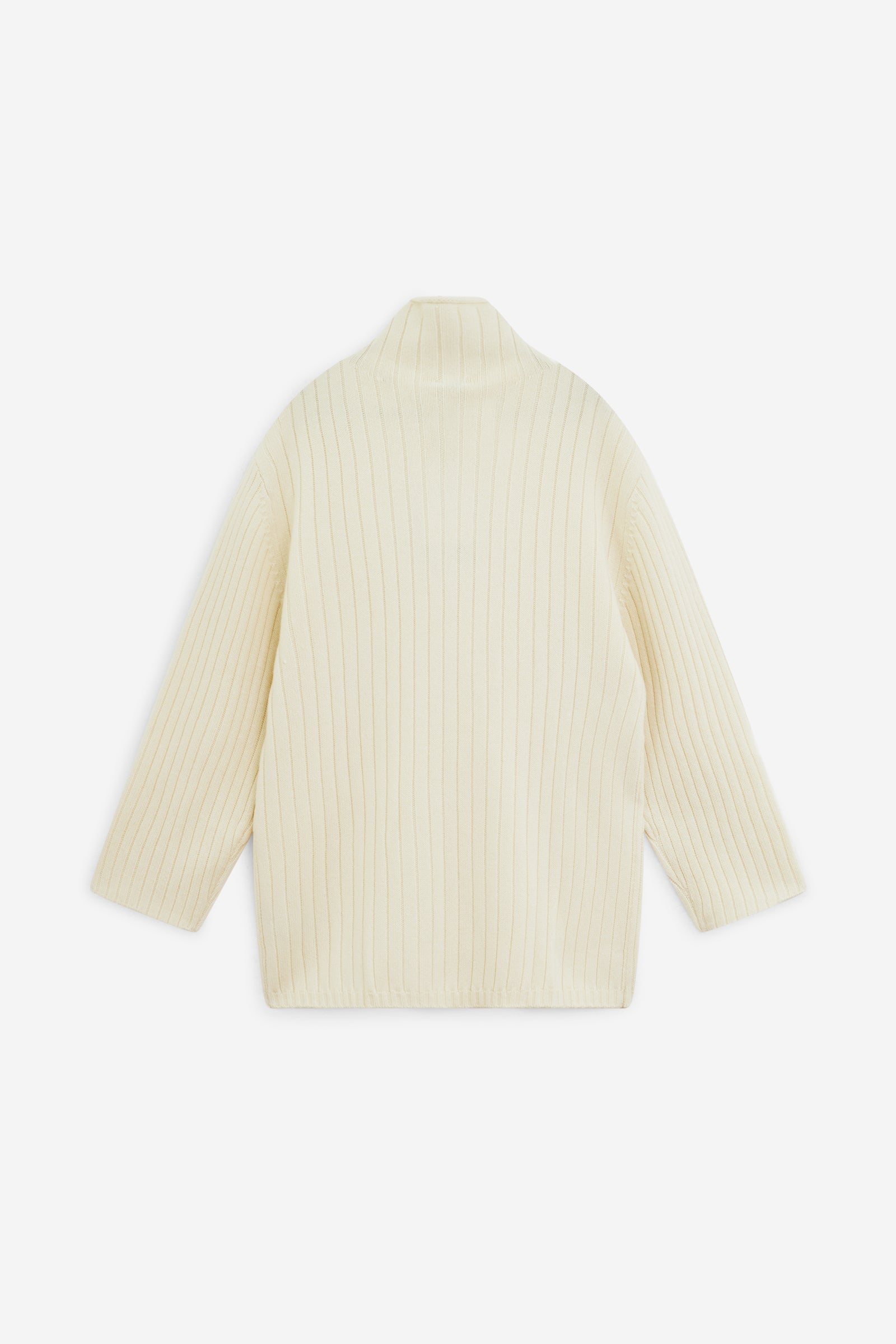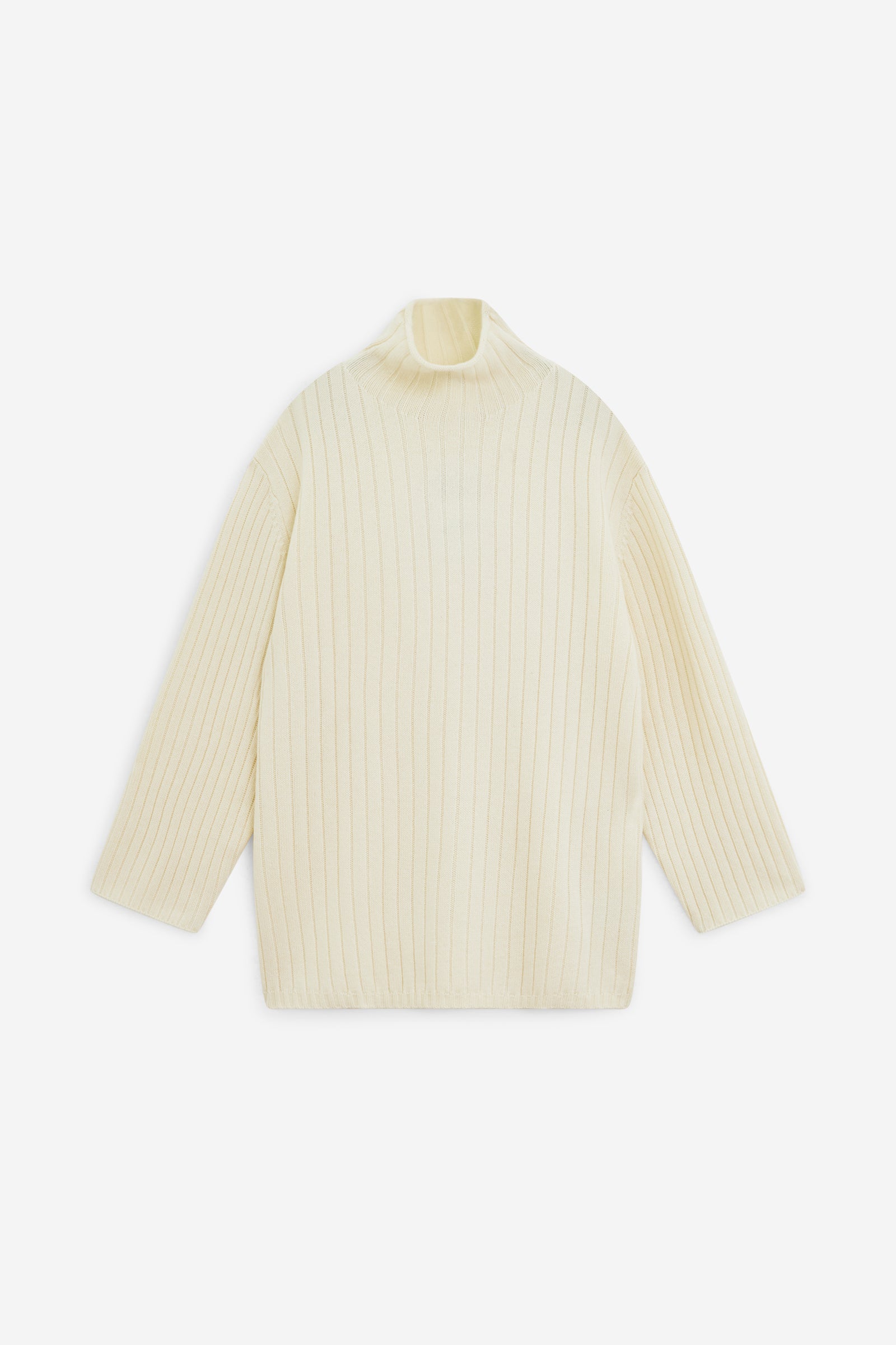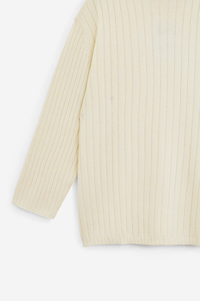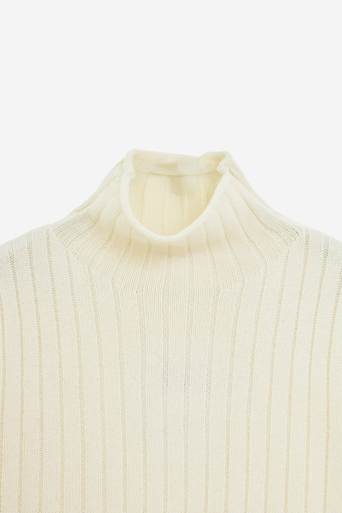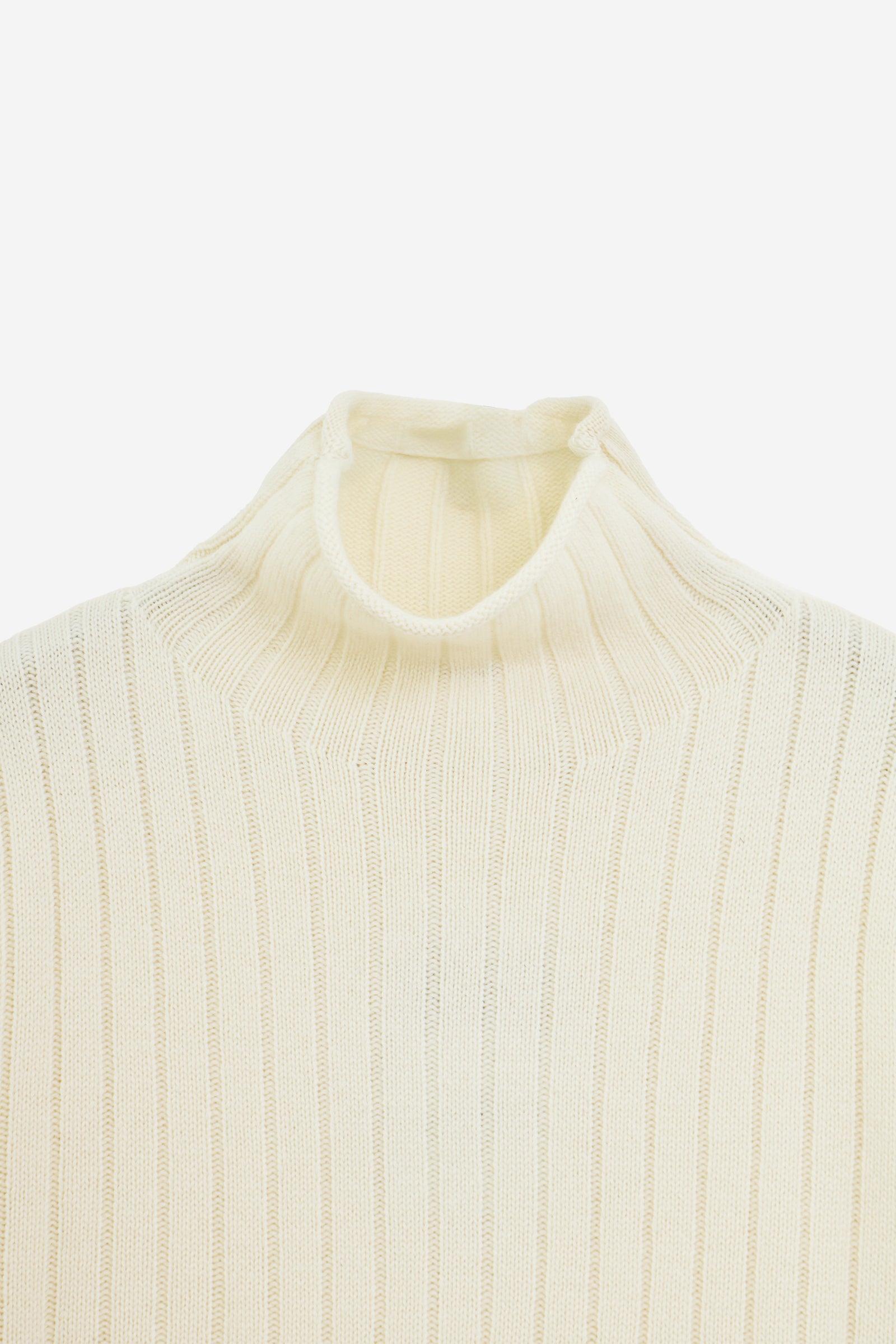 Maglia dolcevita realizzata in pregiata lana super geelong a coste. Il modello presenta maniche lunghe con spalla scesa ed è rifinito dal collo alto con bordo a rollino. Vestibilita ampia