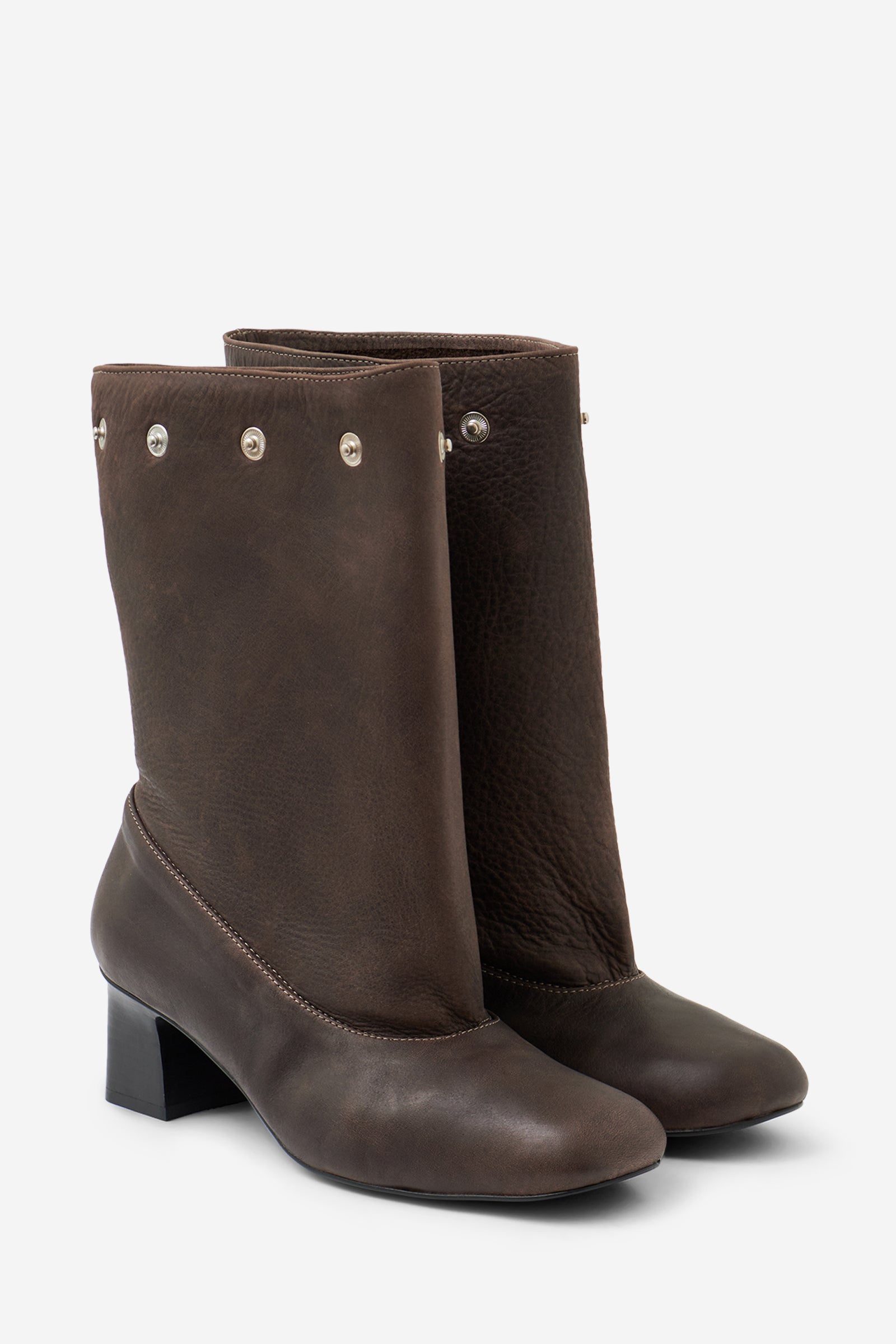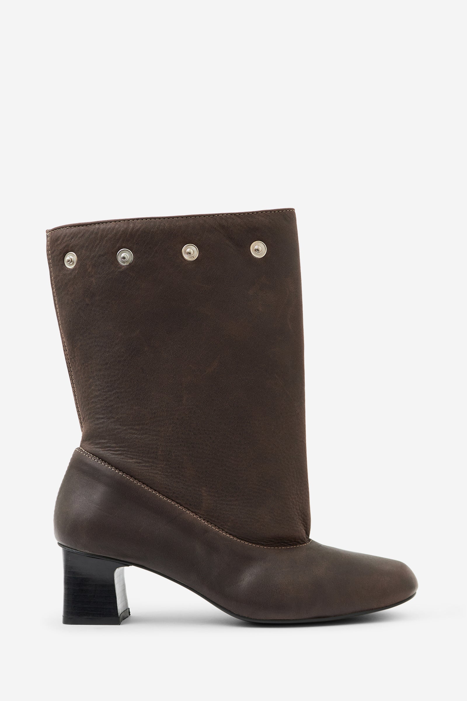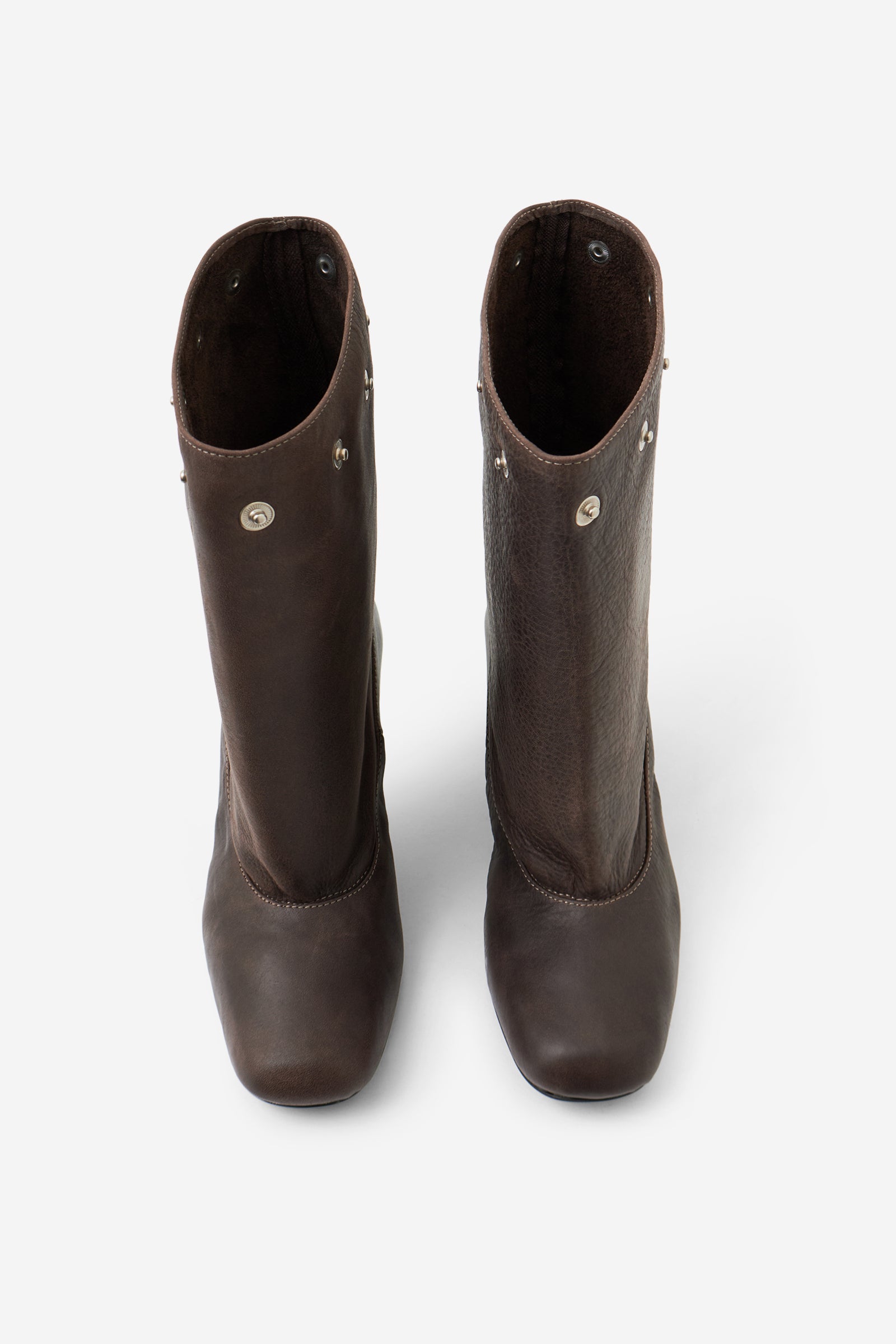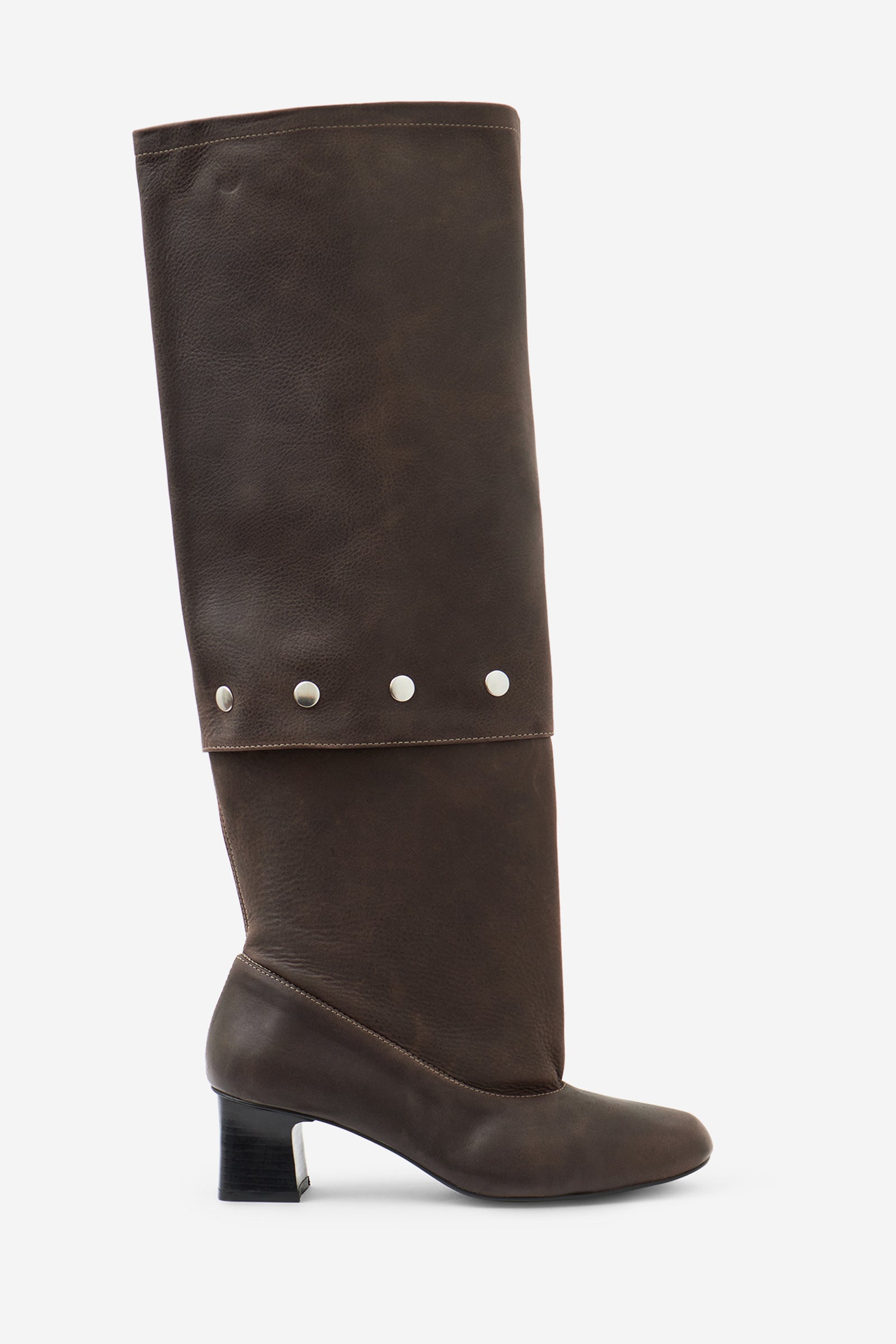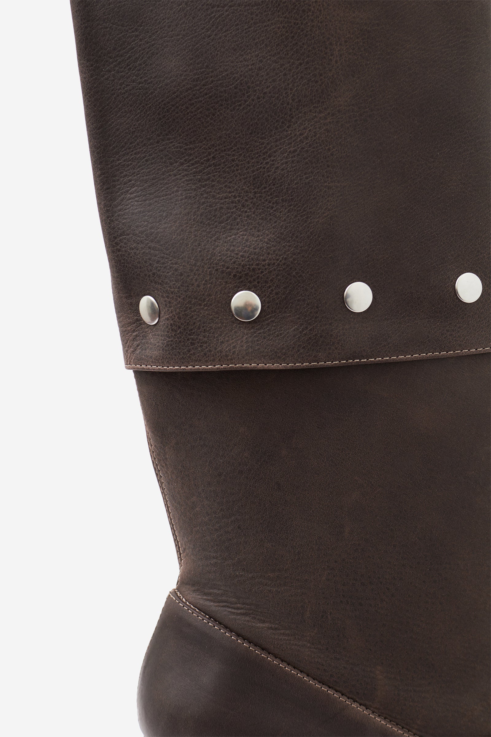 Stivali alti, larghi, con gambale morbido e senza cerniere. Il gambale può essere rimosso trasformandoli in stivaletti, attraverso dei bottoni automatici. La pelle utilizzata ha un aspetto consumato, che fa parte del trattamento molto naturale della pelle