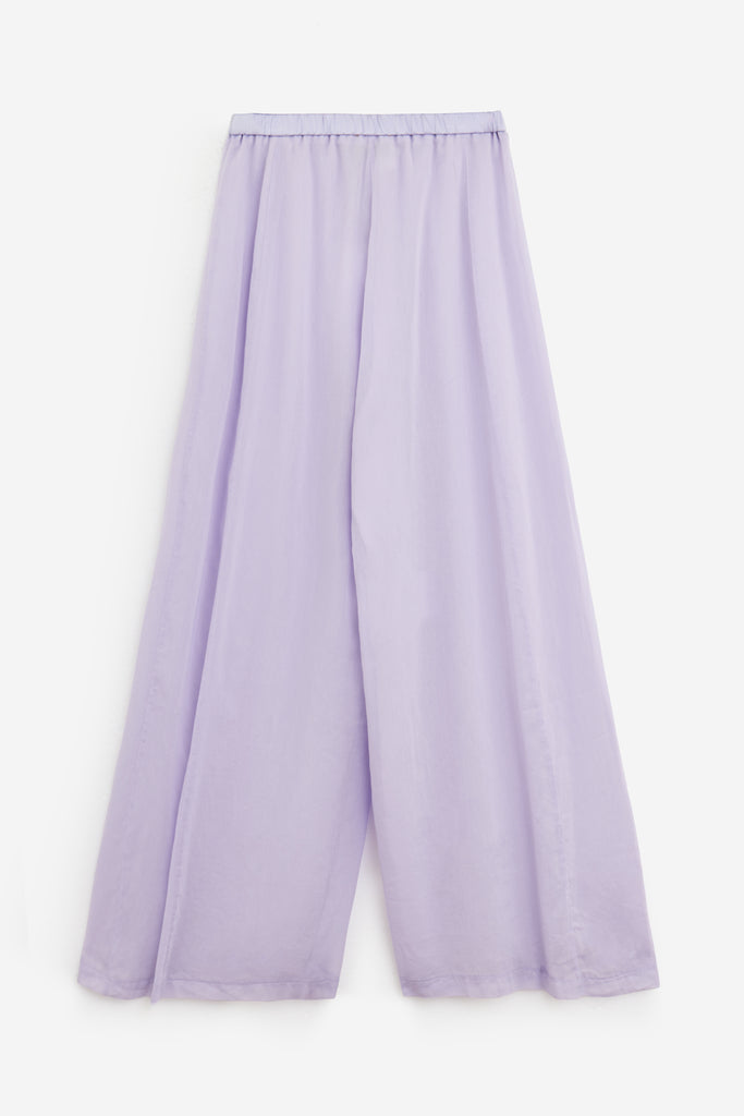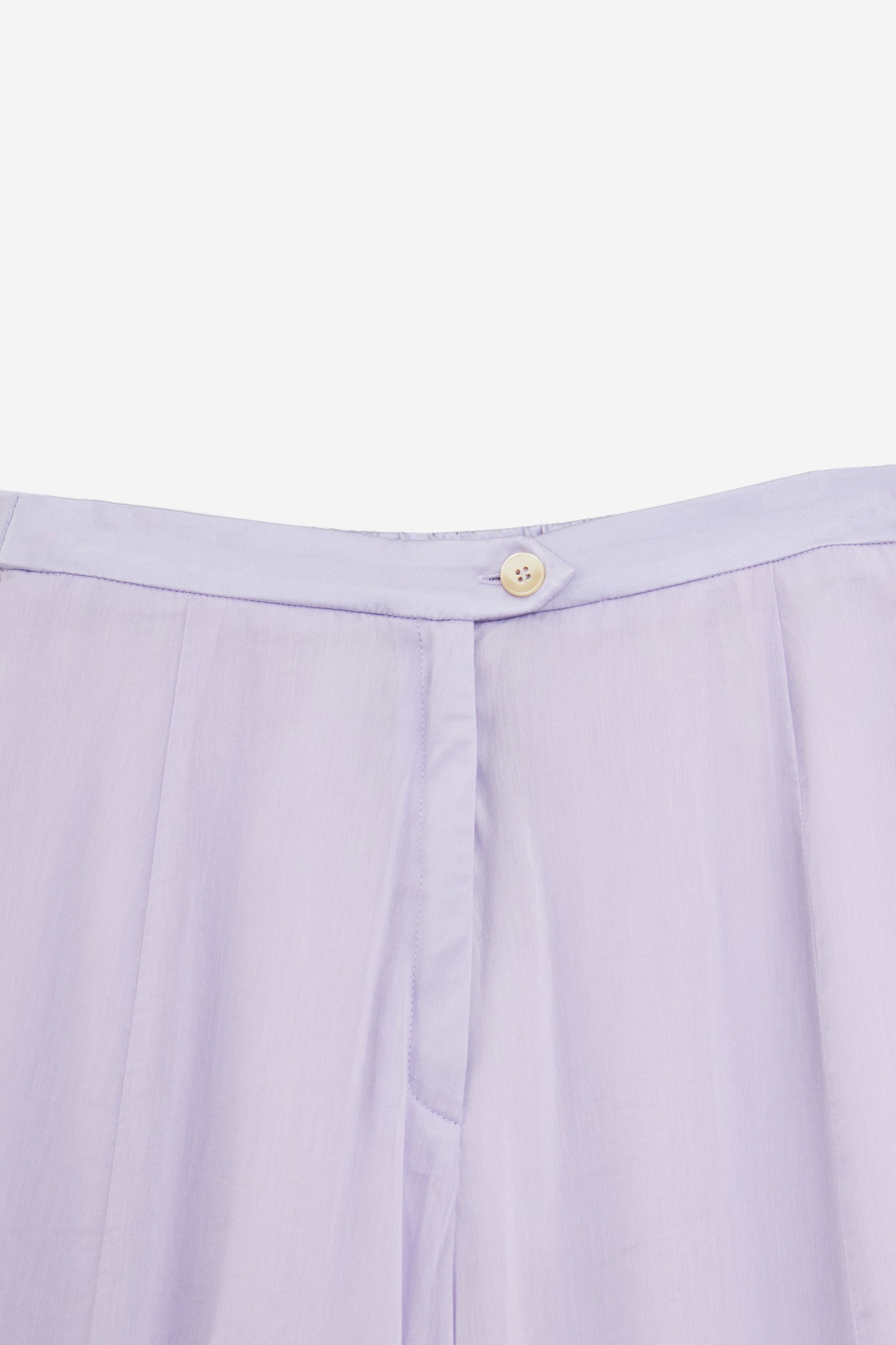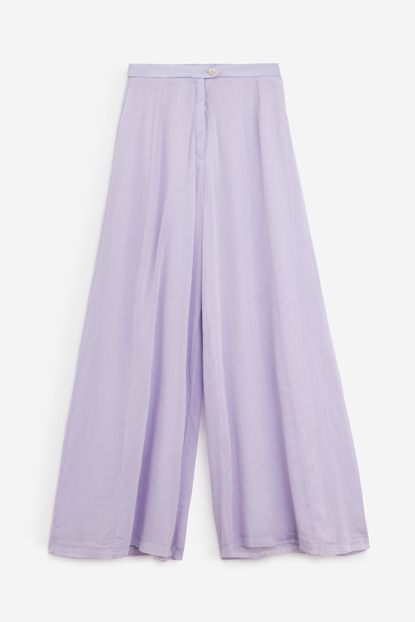 Pantalone in Seta Viola, gamba ampia, chiusura a bottone, tasche laterali