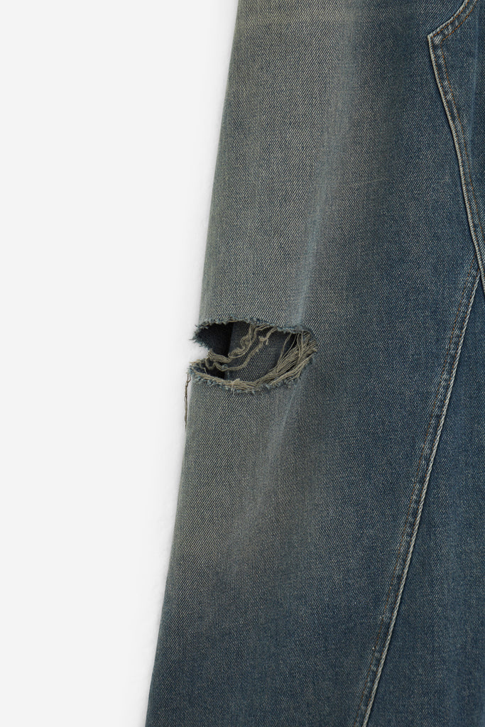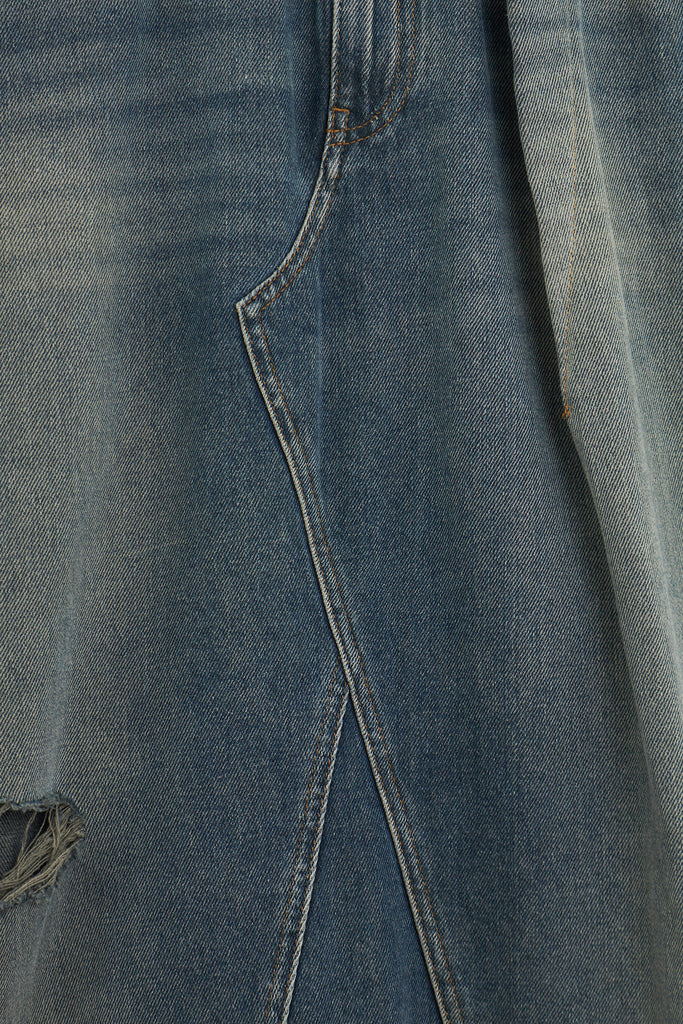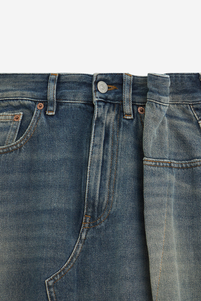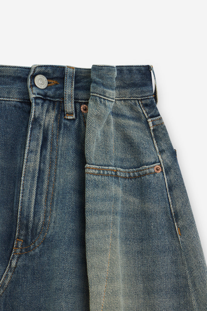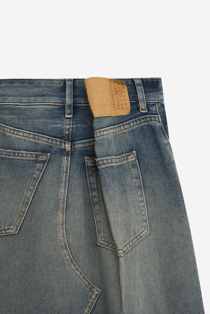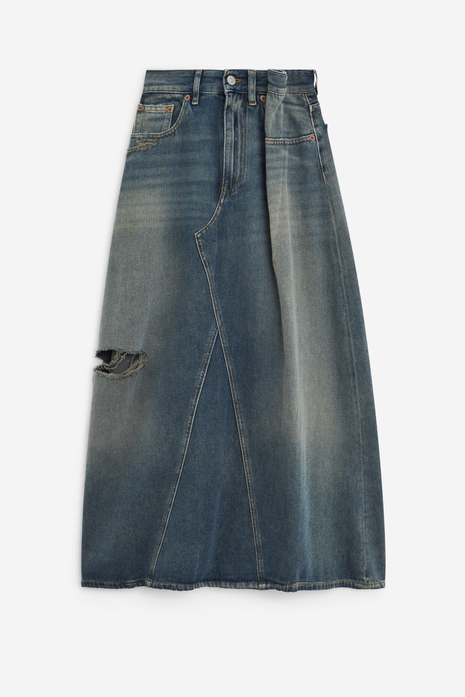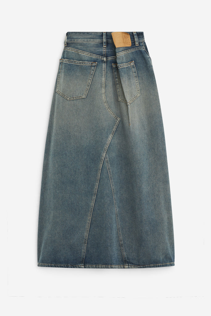 Questa maxi gonna in denim apporta un tocco contemporaneo a un capo base grazie alla cucitura a vista della ripresa di tessuto sul davanti e sul dietro. MM6 crea un design ricontestualizzato creando una gonna con il dettaglio della cucitura centrale come fosse un pantalone creando l'ampiezza nella gonna. Davanti ha un taglio ed è completata da una silhouette a 5 tasche e pasasanti in vita. Il lavaggio del denim è morbido e ha un'effetto sfumato